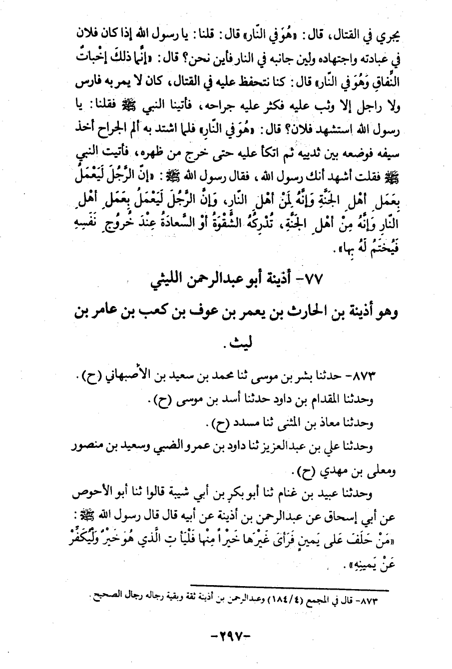 873 - حَدَّثَنَا بِشْرُ بْنُ مُوسَى، ثنا مُحَمَّدُ بْنُ سَعِيدِ بْنِ الْأَصْبَهَانِيُّ، ح وَحَدَّثَنَا الْمِقْدَامُ بْنُ دَاوُدَ، حَدَّثَنَا أَسَدُ بْنُ مُوسَى، ح وَحَدَّثَنَا مُعَاذُ بْنُ الْمُثَنَّى، ثنا مُسَدَّدٌ، ح وَحَدَّثَنَا عَلِيُّ بْنُ عَبْدِ الْعَزِيزِ، ثنا دَاوُدُ بْنُ عَمْرٍو الضَّبِّيُّ، وَسَعِيدُ بْنُ مَنْصُورٍ، وَمُعَلَّى بْنُ مَهْدِيٍّ، ح وَحَدَّثَنَا عُبَيْدُ بْنُ غَنَّامٍ، ثنا أَبُو بَكْرِ بْنُ أَبِي شَيْبَةَ، قَالُوا: ثنا أَبُو الْأَحْوَصِ، عَنْ أَبِي إِسْحَاقَ، عَنْ عَبْدِ الرَّحْمَنِ بْنِ أُذَيْنَةَ، عَنْ أَبِيهِ، قَالَ: قَالَ رَسُولُ اللهِ صَلَّى اللهُ عَلَيْهِ وَسَلَّمَ: «§مَنْ حَلَفَ عَلَى يَمِينٍ فَرَأَى غَيْرَهَا خَيْرًا مِنْهَا فَلْيَأْتِ الَّذِي هُوَ خَيْرٌ، وَلْيُكَفِّرْ عَنْ يَمِينِهِ»