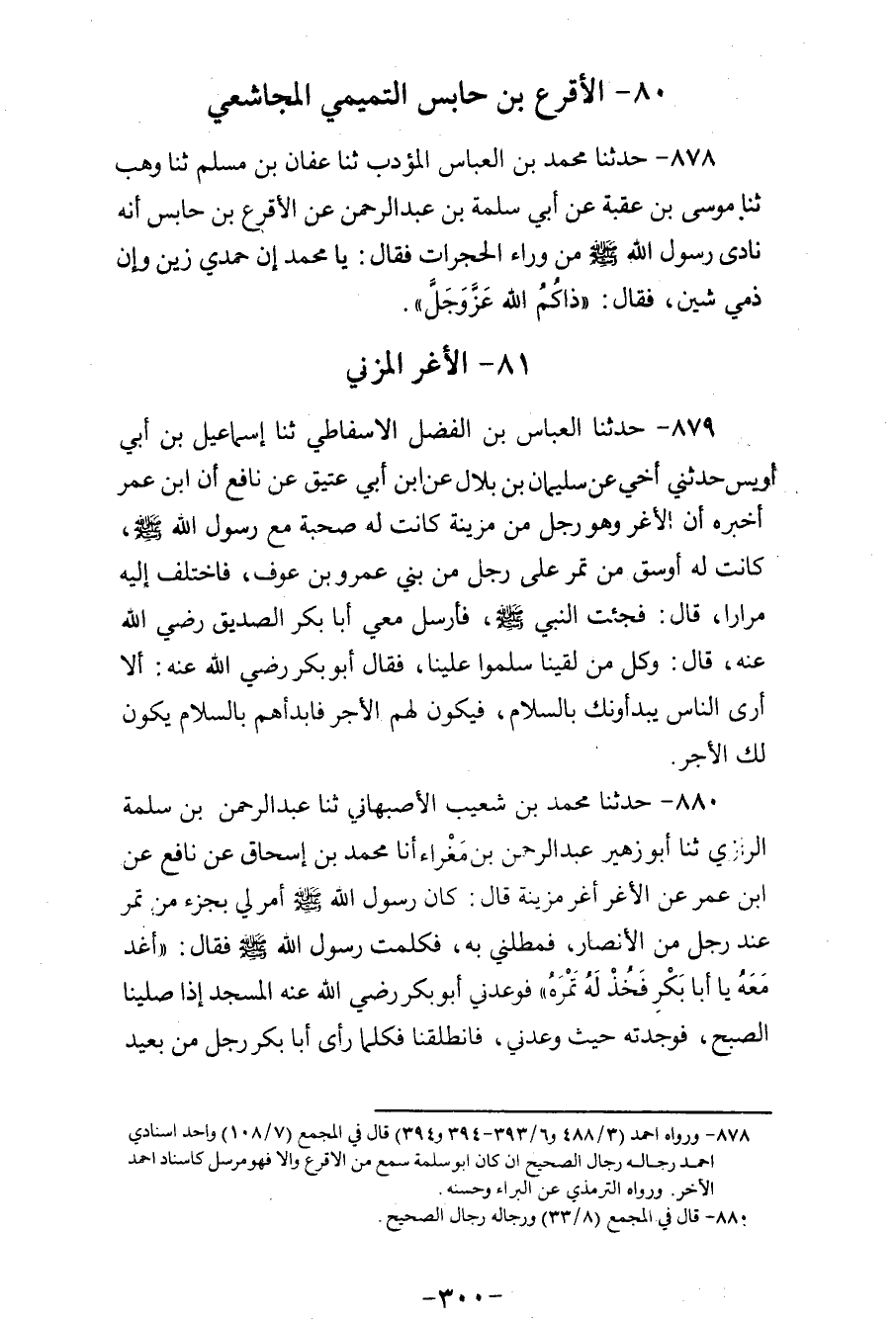 880 - حَدَّثَنَا مُحَمَّدُ بْنُ شُعَيْبٍ الْأَصْبَهَانِيُّ، ثنا عَبْدُ الرَّحْمَنِ بْنُ سَلَمَةَ الرَّازِيُّ، ثنا أَبُو زُهَيْرٍ عَبْدُ الرَّحْمَنِ بْنُ مَغْرَاءَ، أَنَا مُحَمَّدُ بْنُ إِسْحَاقَ، عَنْ نَافِعٍ، عَنِ ابْنِ عُمَرَ، عَنِ الْأَغَرِّ، أَغَرِّ مُزَيْنَةَ، قَالَ: كَانَ رَسُولُ اللهِ صَلَّى اللهُ عَلَيْهِ وَسَلَّمَ أَمَرَ لِي بِجُزْءٍ مِنْ تَمْرٍ عِنْدَ رَجُلٍ مِنَ الْأَنْصَارِ فَمَطَلَنِي بِهِ، فَكَلَّمْتُ رَسُولَ اللهِ صَلَّى اللهُ عَلَيْهِ وَسَلَّمَ، فَقَالَ: «§أغْدُ مَعَهُ يَا أَبَا بَكْرٍ فَخُذْ لَهُ تَمْرَهُ» فَوَعَدَنِي أَبُو بَكْرٍ رَضِيَ اللهُ عَنْهُ الْمَسْجِدَ إِذَا صَلَّيْنَا الصُّبْحَ، فَوَجَدْتُهُ حَيْثُ وَعَدَنِي، فَانْطَلَقْنَا، فَكُلَّمَا رَأَى أَبَا بَكْرٍ رَجُلٌ مِنْ بَعِيدٍ سَلَّمَ عَلَيْهِ، فَقَالَ أَبُو بَكْرٍ: أَمَا تَرَى مَا يُصِيبُ الْقَوْمُ عَلَيْكَ مِنَ الْفَضْلِ، لَا يَسْبِقْكَ إِلَى السَّلَامِ أَحَدٌ، فَكُنَّا إِذَا طَلَعَ الرَّجُلُ بَادَرْنَاهُ بِالسَّلَامِ قَبْلَ أَنْ يُسَلِّمَ عَلَيْنَا