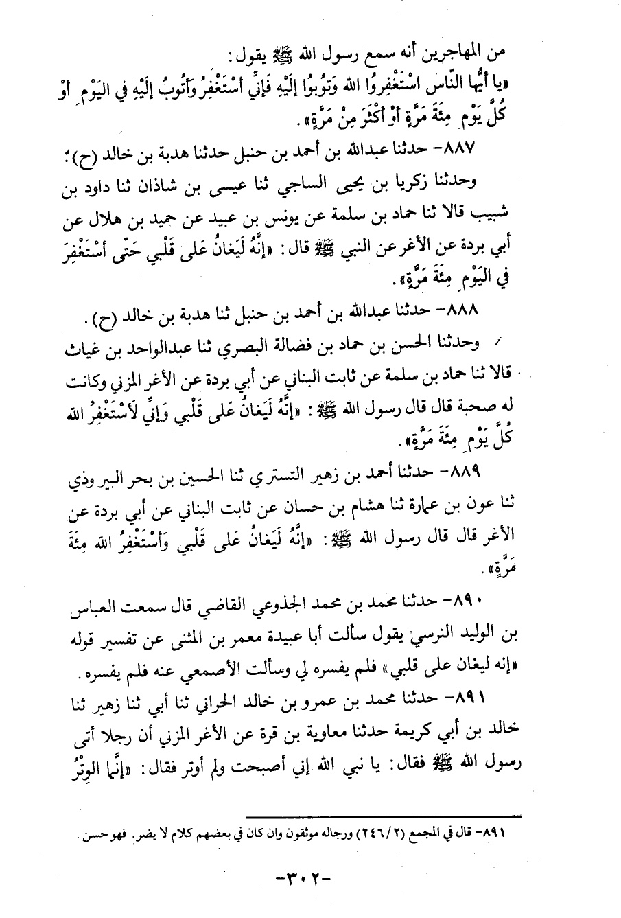888 - حَدَّثَنَا عَبْدُ اللهِ بْنُ أَحْمَدَ بْنِ حَنْبَلٍ، ثنا هُدْبَةُ بْنُ خَالِدٍ، ح وَحَدَّثَنَا الْحَسَنُ بْنُ حَمَّادِ بْنِ فَضَالَةَ الْبَصْرِيُّ، ثنا عَبْدُ الْوَاحِدِ بْنُ غِيَاثٍ، قَالَا: ثنا حَمَّادُ بْنُ سَلَمَةَ، عَنْ ثَابِتٍ الْبُنَانِيِّ، عَنْ أَبِي بُرْدَةَ، عَنِ الْأَغَرِّ الْمُزَنِيِّ، وَكَانَتْ لَهُ صُحْبَةٌ، قَالَ: قَالَ رَسُولُ اللهِ صَلَّى اللهُ عَلَيْهِ وَسَلَّمَ: «إِنَّهُ §لَيُغَانُ عَلَى قَلْبِي، وَإِنِّي لَأَسْتَغْفِرُ اللهَ كُلَّ يَوْمٍ مِائَةَ مَرَّةٍ»