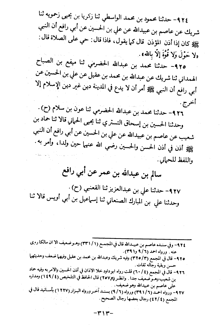 924 - حَدَّثَنَا مَحْمُودُ بْنُ مُحَمَّدٍ الْوَاسِطِيُّ، ثنا زَكَرِيَّا بْنُ يَحْيَى زَحْمَوَيْهِ، ثنا شَرِيكٌ، عَنْ عَاصِمِ بْنِ عُبَيْدِ اللهِ، عَنْ عَلِيِّ بْنِ الْحُسَيْنِ، عَنْ أَبِي رَافِعٍ، أَنَّ النَّبِيَّ صَلَّى اللهُ عَلَيْهِ وَسَلَّمَ كَانَ §إِذَا أَذَّنَ الْمُؤَذِّنُ، قَالَ كَمَا يَقُولُ، فَإِذَا قَالَ: حَيَّ عَلَى الصَّلَاةِ، قَالَ: «لَا حَوْلَ وَلَا قُوَّةَ إِلَّا بِاللهِ»