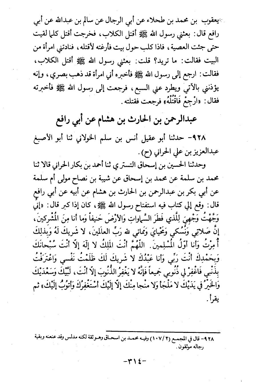 928 - حَدَّثَنَا أَبُو عَقِيلٍ أَنَسُ بْنُ سَلْمٍ الْخَوْلَانِيُّ، ثنا أَبُو الْأَصْبَغِ عَبْدُ الْعَزِيزِ بْنُ عَلِيٍّ الْحَرَّانِيُّ، ح وَحَدَّثَنَا الْحُسَيْنُ بْنُ إِسْحَاقَ التُّسْتَرِيُّ، ثنا أَحْمَدُ بْنُ بَكَّارٍ الْحَرَّانِيُّ، قَالَا: ثنا مُحَمَّدُ بْنُ سَلَمَةَ، عَنْ مُحَمَّدِ بْنِ إِسْحَاقَ، عَنْ شَيْبَةَ بْنِ نَصَّاحٍ، مَوْلَى أُمِّ سَلَمَةَ، عَنْ أَبِي بَكْرِ بْنِ عَبْدِ الرَّحْمَنِ بْنِ الْحَارِثِ بْنِ هِشَامٍ، عَنْ أَبِيهِ، عَنْ أَبِي رَافِعٍ، قَالَ: وَقَعَ إِلَيَّ كِتَابٌ فِيهِ اسْتِفْتَاحُ رَسُولِ اللهِ صَلَّى اللهُ عَلَيْهِ وَسَلَّمَ، كَانَ إِذَا كَبَّرَ قَالَ: «§إِنِّي وَجَّهْتُ وَجْهِيَ لِلَّذِي فَطَرَ السَّمَاوَاتِ وَالْأَرْضَ حَنِيفًا، وَمَا أَنَا مِنَ الْمُشْرِكِينَ، إِنَّ صَلَاتِي وَنُسُكِي وَمَحْيَايَ وَمَمَاتِي لِلَّهِ رَبِّ الْعَالَمِينَ، لَا شَرِيكَ لَهُ، وَبِذَلِكَ أُمِرْتُ وَأَنَا أَوَّلُ الْمُسْلِمِينَ، اللهُمَّ أَنْتَ الْمَلِكُ لَا إِلَهَ إِلَّا أَنْتَ سُبْحَانَكَ، وَبِحَمْدِكَ أَنْتَ رَبِّي وَأَنَا عَبْدُكَ، لَا شَرِيكَ لَكَ، ظَلَمْتُ نَفْسِي وَاعْتَرَفْتُ بِذَنْبِي، فَاغْفِرْ لِي ذُنُوبِي جَمِيعًا، فَإِنَّهُ لَا يَغْفِرُ الذُّنُوبَ إِلَّا أَنْتَ، لَبَّيْكَ وَسَعْدَيْكَ وَالْخَيْرُ فِي يَدَيْكَ، لَا مَلْجَأَ وَلَا مَنْجَا مِنْكَ إِلَّا إِلَيْكَ، أَسْتَغْفِرُكَ وَأَتُوبُ إِلَيْكَ» ثُمَّ يَقْرَأُ