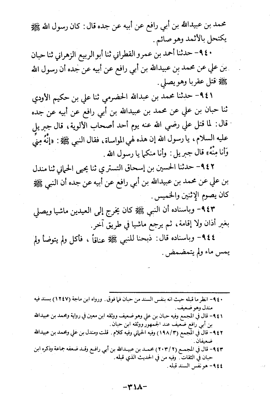 943 - وَبِإِسْنَادِهِ، «أَنَّ النَّبِيَّ صَلَّى اللهُ عَلَيْهِ وَسَلَّمَ كَانَ §يَخْرُجُ إِلَى الْعِيدَيْنِ مَاشِيًا وَيُصَلِّي بِغَيْرِ أَذَانٍ، وَلَا إِقَامَةٍ، ثُمَّ يَرْجِعُ مَاشِيًا فِي طَرِيقٍ آخَرَ»