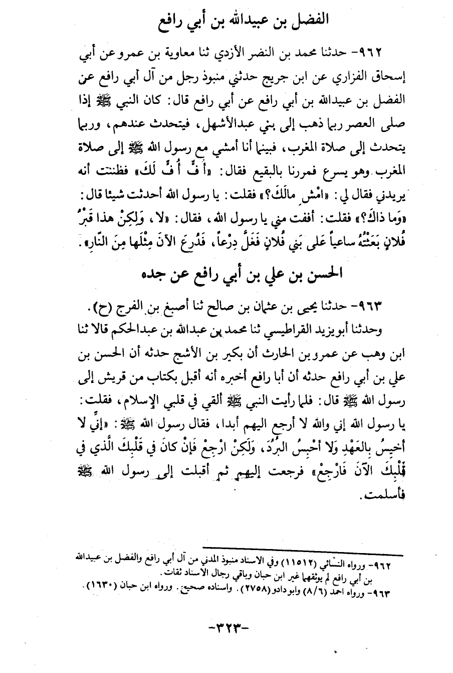 963 - حَدَّثَنَا يَحْيَى بْنُ عُثْمَانَ بْنِ صَالِحٍ، ثنا أَصْبَغُ بْنُ الْفَرَجٍ، ح وَحَدَّثَنَا أَبُو يَزِيدَ الْقَرَاطِيسِيُّ، ثنا مُحَمَّدُ بْنُ عَبْدِ اللهِ بْنِ الْحَكَمٍ، قَالَا: ثنا ابْنُ وَهْبٍ، عَنْ عَمْرِو بْنِ الْحَارِثِ، أَنَّ بُكَيْرَ بْنَ الْأَشَجِّ حَدَّثَهُ، أَنَّ الْحَسَنَ بْنَ عَلِيِّ بْنِ أَبِي رَافِعٍ حَدَّثَهُ، أَنَّ أَبَا رَافِعٍ أَخْبَرَهُ، أَنَّهُ أَقْبَلَ بِكِتَابٍ مِنْ قُرَيْشٍ إِلَى رَسُولِ اللهِ صَلَّى اللهُ عَلَيْهِ وَسَلَّمَ، قَالَ: فَلَمَّا رَأَيْتُ النَّبِيَّ صَلَّى اللهُ عَلَيْهِ وَسَلَّمَ أُلْقِيَ فِي قَلْبِي الْإِسْلَامُ، فَقُلْتُ: يَا رَسُولَ اللهِ، إِنِّي وَاللهِ لَا أَرْجِعُ إِلَيْهِمْ أَبَدًا، فَقَالَ رَسُولُ اللهِ صَلَّى اللهُ عَلَيْهِ وَسَلَّمَ: «إِنِّي §لَا أَخِيسُ بِالْعَهْدِ، وَلَا أَحْبِسُ الْبُرُدَ، وَلَكِنِ ارْجِعْ، فَإِنْ كَانَ فِي قَلْبِكَ الَّذِي فِي قَلْبِكَ الْآنَ فَارْجِعْ» فَرَجَعْتُ إِلَيْهِمْ ثُمَّ أَقْبَلْتُ إِلَى رَسُولِ اللهِ صَلَّى اللهُ عَلَيْهِ وَسَلَّمَ فَأَسْلَمْتُ