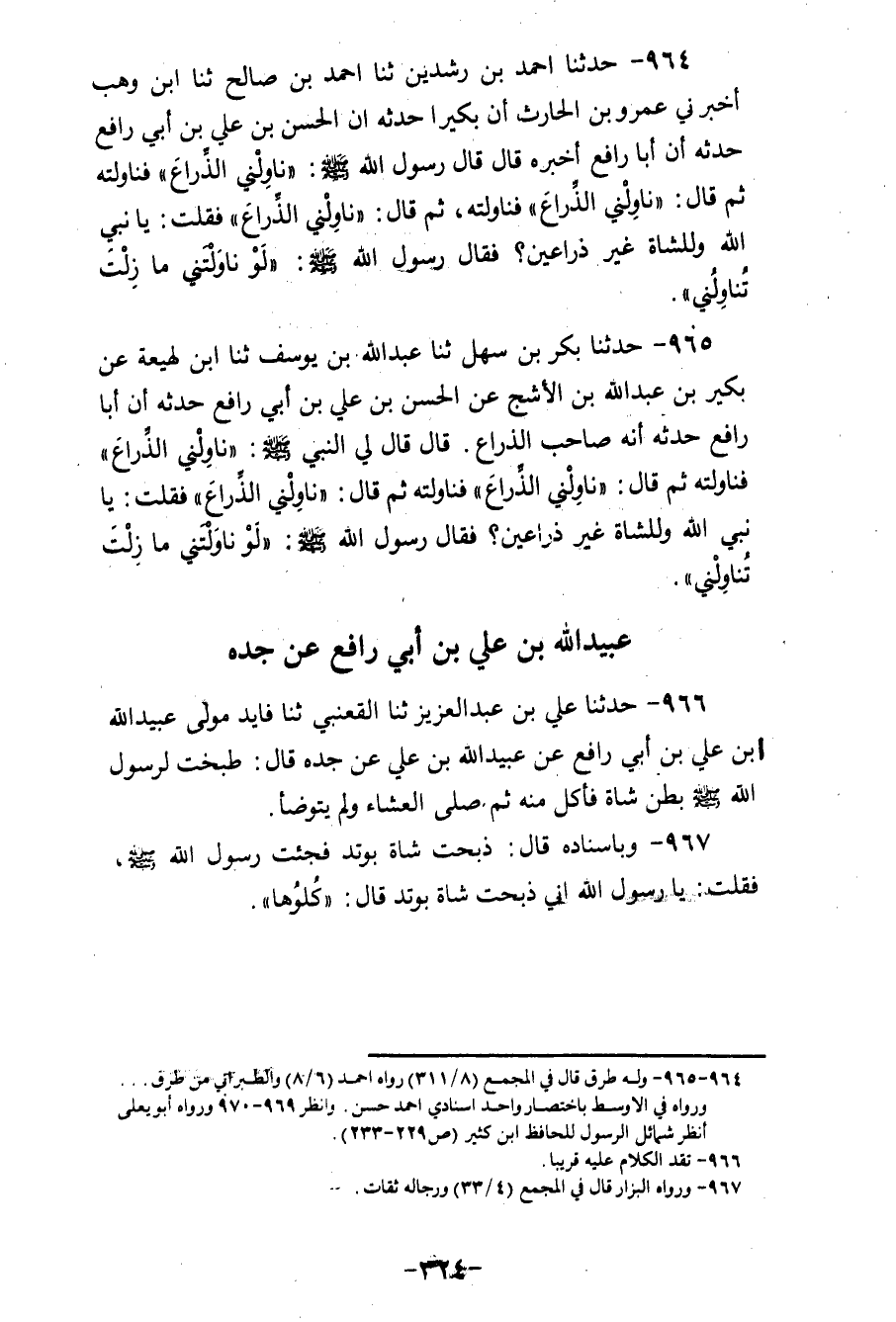 965 - حَدَّثَنَا بَكْرُ بْنُ سَهْلٍ، ثنا عَبْدُ اللهِ بْنُ يُوسُفَ، ثنا ابْنُ لَهِيعَةَ، عَنْ بُكَيْرِ بْنِ عَبْدِ اللهِ بْنِ الْأَشَجِّ، عَنِ الْحَسَنِ بْنِ عَلِيِّ بْنِ أَبِي رَافِعٍ حَدَّثَهُ، أَنَّ أَبَا رَافِعٍ حَدَّثَهُ، أَنَّهُ صَاحِبُ الذِّرَاعِ، قَالَ: قَالَ لِيَ النَّبِيُّ صَلَّى اللهُ عَلَيْهِ وَسَلَّمَ: «نَاوِلْنِي الذِّرَاعَ» فَنَاوَلْتُهُ، ثُمَّ قَالَ: «نَاوِلْنِي الذِّرَاعَ» فَنَاوَلْتُهُ، ثُمَّ قَالَ: «نَاوِلْنِي الذِّرَاعَ» فَقُلْتُ: يَا نَبِيَّ اللهِ، وَلِلشَّاةِ غَيْرُ ذِرَاعَيْنِ، فَقَالَ رَسُولُ اللهِ صَلَّى اللهُ عَلَيْهِ وَسَلَّمَ: «§لَوْ نَاوَلْتَنِي مَا زِلْتَ تُنَاوِلُنِي»