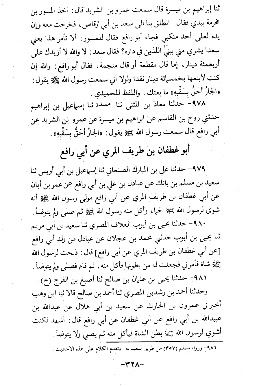 979 - حَدَّثَنَا عَلِيُّ بْنُ الْمُبَارَكِ الصَّنْعَانِيُّ، ثنا إِسْمَاعِيلُ بْنُ أَبِي أُوَيْسٍ، ثنا سَعِيدُ بْنُ مُسْلِمِ بْنِ بَانِكٍ، عَنْ عَبَادِلَ بْنِ عَلِيِّ بْنِ أَبِي رَافِعٍ، عَنْ عُمَرَ بْنِ أَبَانَ، عَنْ أَبِي غَطَفَانَ بْنِ طَرِيفٍ الْمُرِّيِّ، عَنْ أَبِي رَافِعٍ مَوْلَى رَسُولِ اللهِ صَلَّى اللهُ عَلَيْهِ وَسَلَّمَ «أَنَّهُ شَوَى لِرَسُولِ اللهِ صَلَّى اللهُ عَلَيْهِ وَسَلَّمَ لَحْمًا، §وَأَكَلَ مِنْهُ رَسُولُ اللهِ صَلَّى اللهُ عَلَيْهِ وَسَلَّمَ، ثُمَّ صَلَّى، وَلَمْ يَتَوَضَّأْ»
