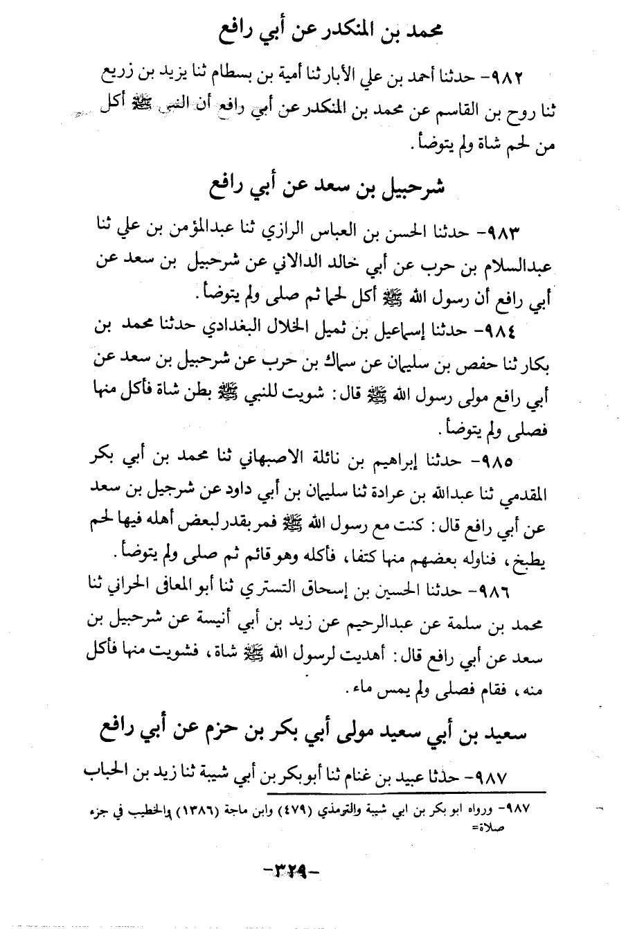 984 - حَدَّثَنَا إِسْمَاعِيلُ بْنُ ثُمَيْلٍ الْخَلَّالُ الْبَغْدَادِيُّ، حَدَّثَنَا مُحَمَّدُ بْنُ بَكَّارٍ، ثنا حَفْصُ بْنُ سُلَيْمَانَ، عَنْ سِمَاكِ بْنِ حَرْبٍ، عَنْ شُرَحْبِيلَ بْنِ سَعْدٍ، عَنْ أَبِي رَافِعٍ مَوْلَى رَسُولِ اللهِ صَلَّى اللهُ عَلَيْهِ وَسَلَّمَ، قَالَ: «شَوَيْتُ لِلنَّبِيِّ صَلَّى اللهُ عَلَيْهِ وَسَلَّمَ بَطْنَ شَاةٍ §فَأَكَلَ مِنْهَا فَصَلَّى وَلَمْ يَتَوَضَّأْ»