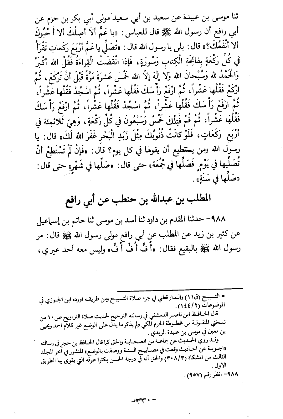 988 - حَدَّثَنَا الْمُقَدَّمُ بْنُ دَاوُدَ، ثنا أَسَدُ بْنُ مُوسَى، ثنا حَاتِمُ بْنُ إِسْمَاعِيلَ، عَنْ كَثِيرِ بْنِ زَيْدٍ، عَنِ الْمُطَّلِبِ، عَنْ أَبِي رَافِعٍ مَوْلَى رَسُولِ اللهِ صَلَّى اللهُ عَلَيْهِ وَسَلَّمَ، قَالَ: مَرَّ رَسُولُ اللهِ صَلَّى اللهُ عَلَيْهِ وَسَلَّمَ بِالْبَقِيعِ، فَقَالَ: «أُفٍّ، أُفٍّ، أُفٍّ» وَلَيْسَ مَعَهُ أَحَدٌ غَيْرِي، فَرَاعَنِي فَقُلْتُ: بِأَبِي أَنْتَ وَأُمِّي، قَالَ: «§صَاحِبُ هَذِهِ الْحُفْرَةِ اسْتَعْمَلْتُهُ عَلَى بَنِي فُلَانٍ، فَخَانَ بُرْدَةً، فَأُرِيتُهَا عَلَيْهِ تَلْتَهَبُ»