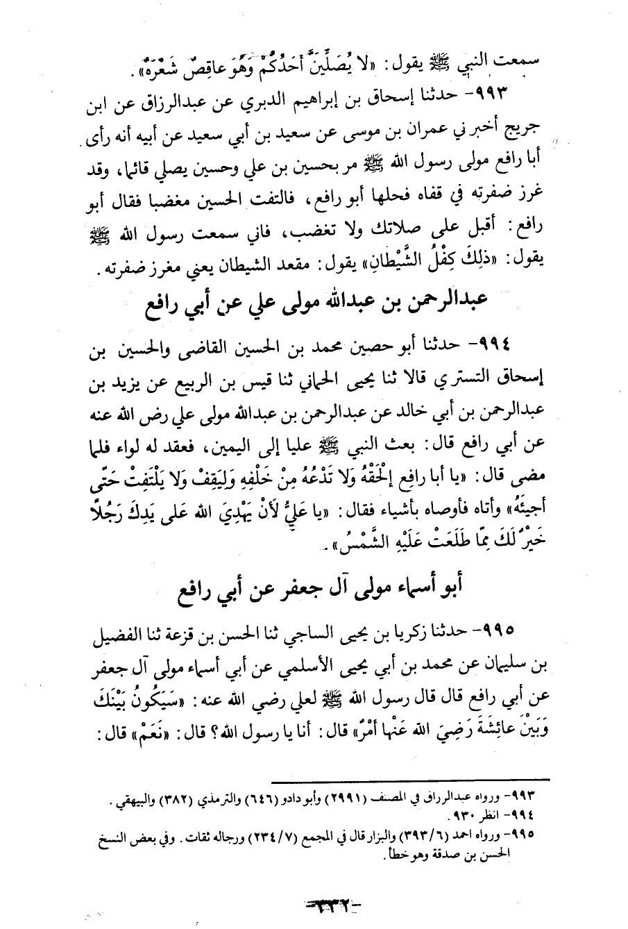 993 - حَدَّثَنَا إِسْحَاقُ بْنُ إِبْرَاهِيمَ الدَّبَرِيُّ، عَنْ عَبْدِ الرَّزَّاقِ، عَنِ ابْنِ جُرَيْجٍ، أَخْبَرَنِي عِمْرَانُ بْنُ مُوسَى، عَنْ سَعِيدِ بْنِ أَبِي سَعِيدٍ، عَنْ أَبِيهِ، أَنَّهُ رَأَى أَبَا رَافِعٍ مَوْلَى رَسُولِ اللهِ صَلَّى اللهُ عَلَيْهِ وَسَلَّمَ مَرَّ بِحُسَيْنِ بْنِ عَلِيٍّ، وَحُسَيْنٌ يُصَلِّي قَائِمًا، وَقَدْ غَرَزَ ضَفْرَتَهُ فِي قَفَاهُ، فَحَلَّهَا أَبُو رَافِعٍ، فَالْتَفَتَ الْحُسَيْنُ مُغْضَبًا، فَقَالَ أَبُو رَافِعٍ: أَقْبِلْ عَلَى صَلَاتِكَ وَلَا تَغْضَبْ، فَإِنِّي سَمِعْتُ رَسُولَ اللهِ صَلَّى اللهُ عَلَيْهِ وَسَلَّمَ يَقُولُ: «§ذَلِكَ كِفْلُ الشَّيْطَانِ» ، يَقُولُ: مَقْعَدُ الشَّيْطَانِ، يَعْنِي مَغْرَزَ ضَفْرَتِهِ