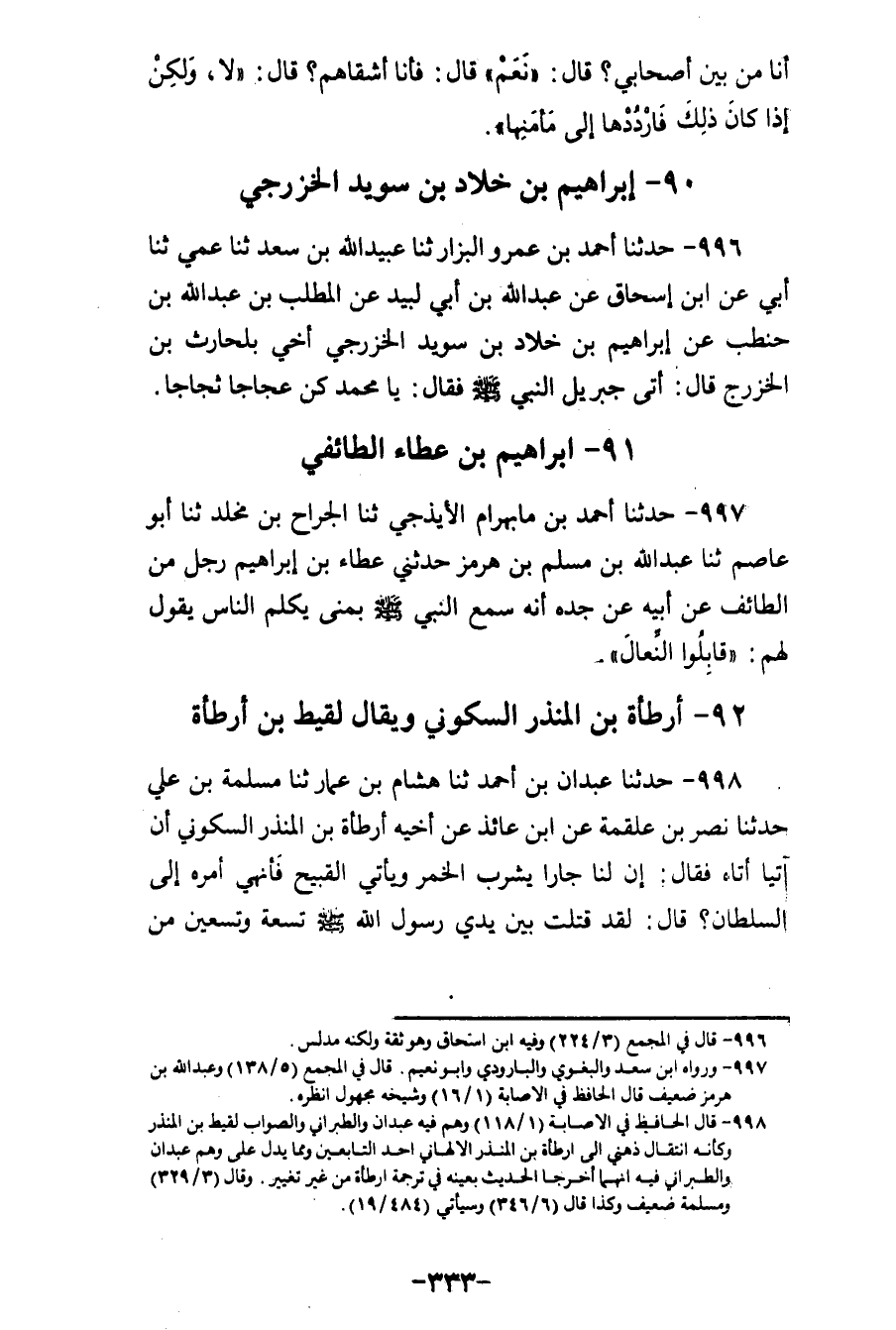 998 - حَدَّثَنَا عَبْدَانُ بْنُ أَحْمَدَ، ثنا هِشَامُ بْنُ عَمَّارٍ، ثنا مَسْلَمَةُ بْنُ عُلَيٍّ، حَدَّثَنَا نَصْرُ بْنُ عَلْقَمَةَ، عَنِ ابْنِ عَائِذٍ، عَنْ أَخِيهِ أَرْطَاةَ بْنِ الْمُنْذِرِ السَّكُونِيِّ، أَنَّ آتِيًا أَتَاهُ، فَقَالَ: إِنَّ لَنَا جَارًا يَشْرَبُ الْخَمْرَ، وَيَأْتِي الْقَبِيحَ، فَأُنْهِيَ أَمْرُهُ إِلَى السُّلْطَانِ؟ قَالَ: «لَقَدْ §قَتَلْتُ بَيْنَ يَدَيْ رَسُولِ اللهِ صَلَّى اللهُ عَلَيْهِ وَسَلَّمَ تِسْعَةً وَتِسْعِينَ مِنَ الْمُشْرِكِينَ، مَا يَسُرُّنِي أَنِّي قَتَلْتُ مَثَلُهُمْ، وَأَنِّي كَشَفْتُ قِنَاعَ مُسْلِمٍ»