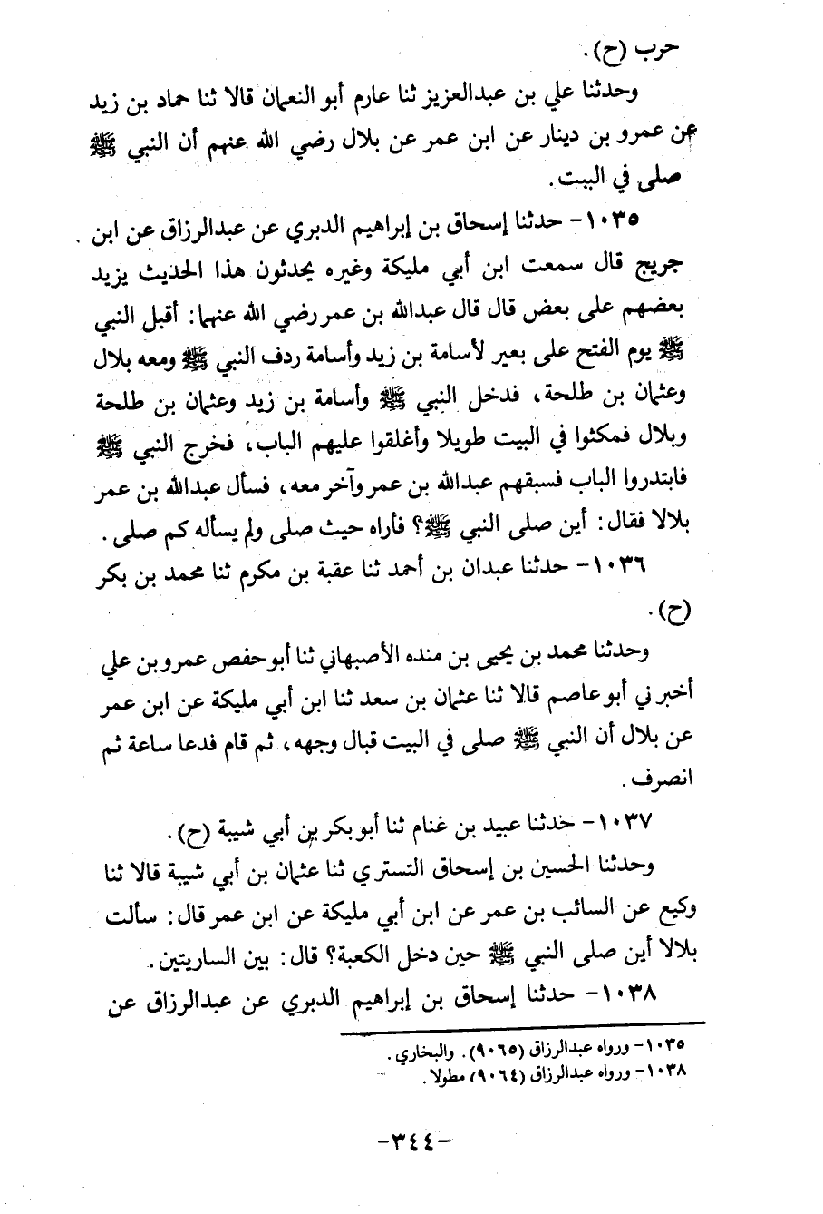 1035 - حَدَّثَنَا إِسْحَاقُ بْنُ إِبْرَاهِيمَ الدَّبَرِيُّ، عَنْ عَبْدِ الرَّزَّاقِ، عَنِ ابْنِ جُرَيْجٍ، قَالَ: سَمِعْتُ ابْنَ أَبِي مُلَيْكَةَ، وَغَيْرَهُ، يُحَدِّثُونَ هَذَا الْحَدِيثَ، يَزِيدُ بَعْضُهُمْ عَلَى بَعْضٍ، قَالَ: قَالَ عَبْدُ اللهِ بْنُ عُمَرَ رَضِيَ اللهُ عَنْهُمَا: «أَقْبَلَ النَّبِيُّ صَلَّى اللهُ عَلَيْهِ وَسَلَّمَ يَوْمَ الْفَتْحِ عَلَى بَعِيرٍ لِأُسَامَةَ بْنِ زَيْدٍ، وَأُسَامَةُ رِدْفُ النَّبِيِّ صَلَّى اللهُ عَلَيْهِ وَسَلَّمَ، وَمَعَهُ بِلَالٌ وَعُثْمَانُ بْنُ طَلْحَةَ، فَدَخَلَ النَّبِيُّ صَلَّى اللهُ عَلَيْهِ وَسَلَّمَ، وَأُسَامَةُ بْنُ زَيْدٍ، وَعُثْمَانُ بْنُ طَلْحَةَ، وَبِلَالٌ، فَمَكَثُوا فِي الْبَيْتِ طَوِيلًا وَأَغْلَقُوا عَلَيْهِمُ الْبَابَ، فَخَرَجَ النَّبِيُّ صَلَّى اللهُ عَلَيْهِ وَسَلَّمَ فَابْتَدَرُوا الْبَابَ» فَسَبَقَهُمْ عَبْدُ اللهِ بْنُ عُمَرَ وَآخَرُ مَعَهُ، فَسَأَلَ عَبْدُ اللهِ بْنُ عُمَرَ بِلَالًا، فَقَالَ: §أَيْنَ صَلَّى النَّبِيُّ صَلَّى اللهُ عَلَيْهِ وَسَلَّمَ «فَأَرَاهُ حَيْثُ صَلَّى» وَلَمْ يَسْأَلْهُ كَمْ صَلَّى