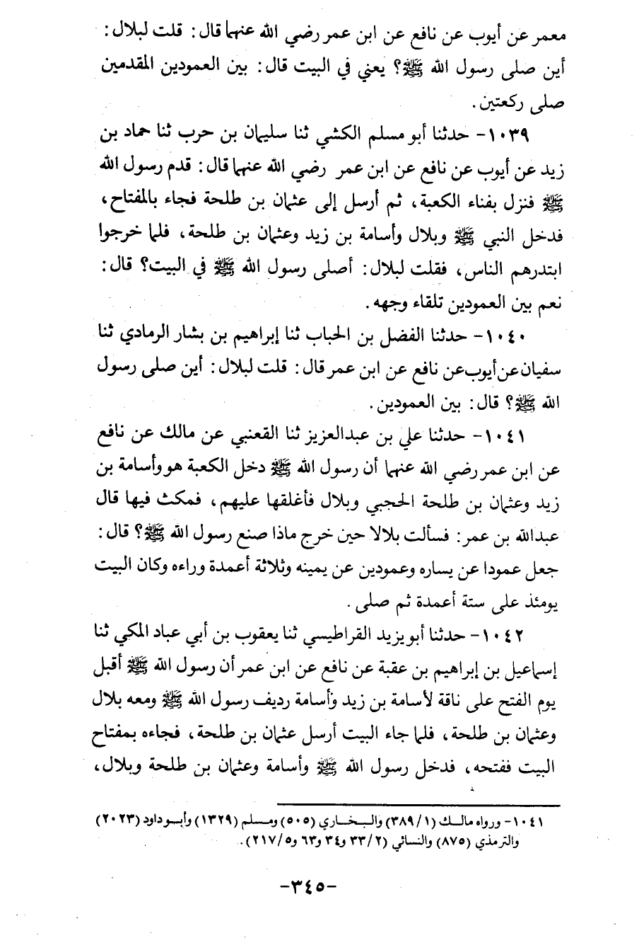 1039 - حَدَّثَنَا أَبُو مُسْلِمٍ الْكَشِّيُّ، ثنا سُلَيْمَانُ بْنُ حَرْبٍ، ثنا حَمَّادُ بْنُ زَيْدٍ، عَنْ أَيُّوبَ، عَنْ نَافِعٍ، عَنِ ابْنِ عُمَرَ رَضِيَ اللهُ عَنْهُمَا، قَالَ: «قَدِمَ رَسُولُ اللهِ صَلَّى اللهُ عَلَيْهِ وَسَلَّمَ فَنَزَلَ بِفِنَاءِ الْكَعْبَةِ، ثُمَّ أَرْسَلَ إِلَى عُثْمَانَ بْنِ طَلْحَةَ فَجَاءَ بِالْمِفْتَاحِ، فَدَخَلَ النَّبِيُّ صَلَّى اللهُ عَلَيْهِ وَسَلَّمَ وَبِلَالٌ، وَأُسَامَةُ بْنُ زَيْدٍ وَعُثْمَانُ بْنُ طَلْحَةَ» فَلَمَّا خَرَجُوا ابْتَدَرَهُمُ النَّاسُ، فَقُلْتُ لِبِلَالٍ: §أَصَلَّى رَسُولُ اللهِ صَلَّى اللهُ عَلَيْهِ وَسَلَّمَ فِي الْبَيْتِ؟ قَالَ: نَعَمْ «بَيْنَ الْعَمُودَيْنِ تِلْقَاءَ وَجْهِهِ»