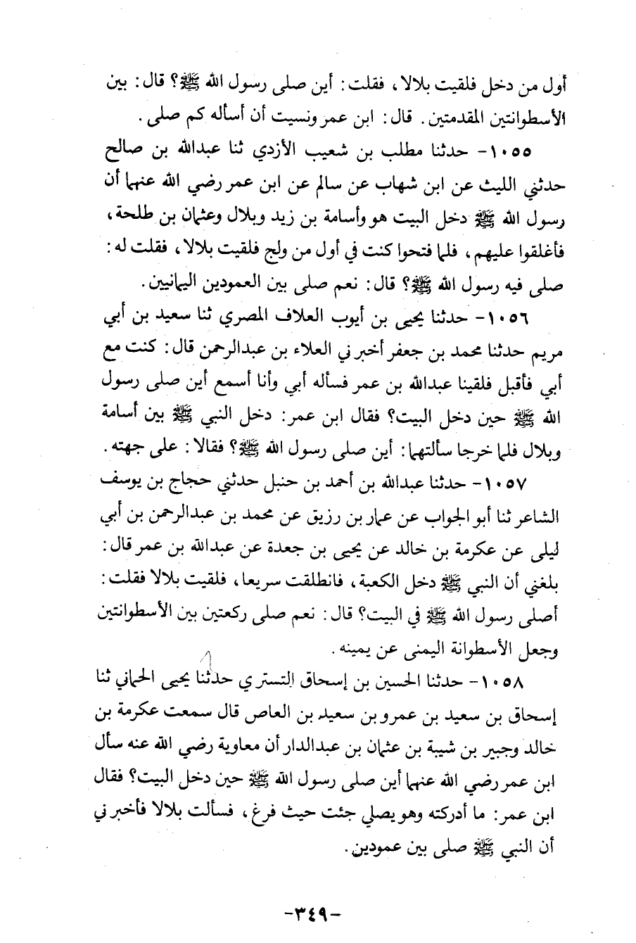 1055 - حَدَّثَنَا مُطَّلِبُ بْنُ شُعَيْبٍ الْأَزْدِيُّ، ثنا عَبْدُ اللهِ بْنُ صَالِحٍ، حَدَّثَنِي اللَّيْثُ، عَنِ ابْنِ شِهَابٍ، عَنْ سَالِمٍ، عَنِ ابْنِ عُمَرَ رَضِيَ اللهُ عَنْهُمَا «أَنَّ رَسُولَ اللهِ صَلَّى اللهُ عَلَيْهِ وَسَلَّمَ دَخَلَ الْبَيْتَ هُوَ وَأُسَامَةُ بْنُ زَيْدٍ، وَبِلَالٌ، وَعُثْمَانُ بْنُ طَلْحَةَ فَأَغْلَقُوا عَلَيْهِمْ» فَلَمَّا فَتَحُوا كُنْتُ فِي أَوَّلِ مَنْ وَلَجَ، فَلَقِيتُ بِلَالًا فَقُلْتُ لَهُ: صَلَّى فِيهِ رَسُولُ اللهِ صَلَّى اللهُ عَلَيْهِ وَسَلَّمَ؟ قَالَ: نَعَمْ «§صَلَّى بَيْنَ الْعَمُودَيْنِ الْيَمَانِيَيْنِ»