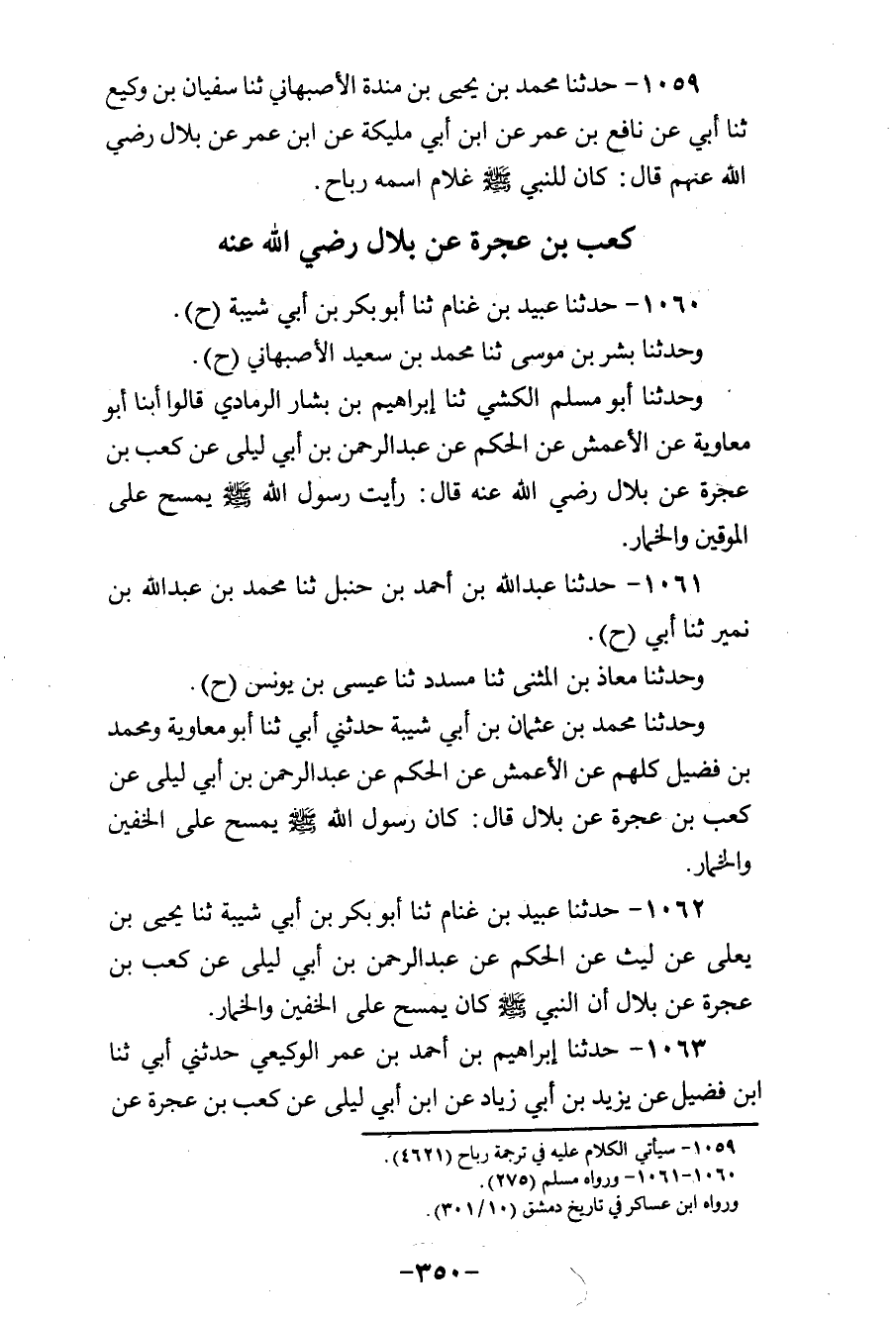 1061 - حَدَّثَنَا عَبْدُ اللهِ بْنُ أَحْمَدَ بْنِ حَنْبَلٍ، ثنا مُحَمَّدُ بْنُ عَبْدِ اللهِ بْنِ نُمَيْرٍ، ثنا أَبِي، ح وَحَدَّثَنَا مُعَاذُ بْنُ الْمُثَنَّى، ثنا مُسَدَّدٌ، ثنا عِيسَى بْنُ يُونُسَ، ح وَحَدَّثَنَا مُحَمَّدُ بْنُ عُثْمَانَ بْنِ أَبِي شَيْبَةَ، حَدَّثَنِي أَبِي، ثنا أَبُو مُعَاوِيَةَ، وَمُحَمَّدُ بْنُ فُضَيْلٍ، كُلُّهُمْ عَنِ الْأَعْمَشِ، عَنِ الْحَكَمِ، عَنْ عَبْدِ الرَّحْمَنِ بْنِ أَبِي لَيْلَى، عَنْ كَعْبِ بْنِ عُجْرَةَ، عَنْ بِلَالٍ، قَالَ: «كَانَ رَسُولُ اللهِ صَلَّى اللهُ عَلَيْهِ وَسَلَّمَ §يَمْسَحُ عَلَى الْخُفَّيْنِ وَالْخِمَارِ»