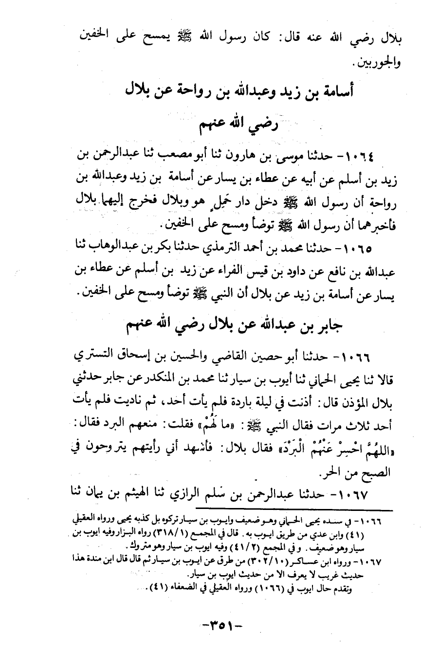 1064 - حَدَّثَنَا مُوسَى بْنُ هَارُونَ، ثنا أَبُو مُصْعَبٍ، ثنا عَبْدُ الرَّحْمَنِ بْنُ زَيْدِ بْنِ أَسْلَمَ، عَنْ أَبِيهِ، عَنْ عَطَاءِ بْنِ يَسَارٍ، عَنْ أُسَامَةَ بْنِ زَيْدٍ، وَعَبْدِ اللهِ بْنِ رَوَاحَةَ، أَنَّ رَسُولَ اللهِ صَلَّى اللهُ عَلَيْهِ وَسَلَّمَ دَخَلَ دَارَ حَمَلٍ هُوَ وَبِلَالٌ، فَخَرَجَ إِلَيْهِمَا بِلَالٌ فَأَخْبَرَهُمَا «أَنَّ رَسُولَ اللهِ صَلَّى اللهُ عَلَيْهِ وَسَلَّمَ §تَوَضَّأَ وَمَسَحَ عَلَى الْخُفَّيْنِ»