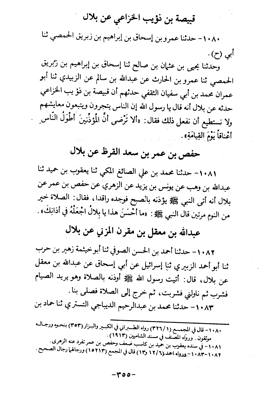 1080 - حَدَّثَنَا عَمْرُو بْنُ إِسْحَاقَ بْنِ إِبْرَاهِيمَ بْنِ زِبْرِيقٍ الْحِمْصِيُّ، ثنا أَبِي، ح وَحَدَّثَنَا يَحْيَى بْنُ عُثْمَانَ بْنِ صَالِحٍ، ثنا إِسْحَاقُ بْنُ إِبْرَاهِيمَ بْنِ زِبْرِيقٍ الْحِمْصِيُّ، ثنا عَمْرُو بْنُ الْحَارِثِ، عَنْ عَبْدِ اللهِ بْنِ سَالِمٍ، عَنِ الزُّبَيْدِيِّ، ثنا أَبُو عِمْرَانَ مُحَمَّدُ بْنُ أَبِي سُفْيَانَ الثَّقَفِيُّ حَدَّثَهُمْ، أَنَّ قَبِيصَةَ بْنَ ذُؤَيْبٍ الْخُزَاعِيَّ حَدَّثَهُ، عَنْ بِلَالٍ، أَنَّهُ قَالَ: يَا رَسُولَ اللهِ، إِنَّ النَّاسَ يَتَّجِرُونَ وَيَتَّبِعُونُ مَعَايِشَهُمْ، وَلَا نَسْتَطِيعُ أَنْ نَفْعَلَ ذَلِكَ، فَقَالَ: «أَلَا تَرْضَى §أَنَّ الْمُؤَذِّنِينَ أَطْوَلُ النَّاسِ أَعْنَاقًا يَوْمَ الْقِيَامَةِ»