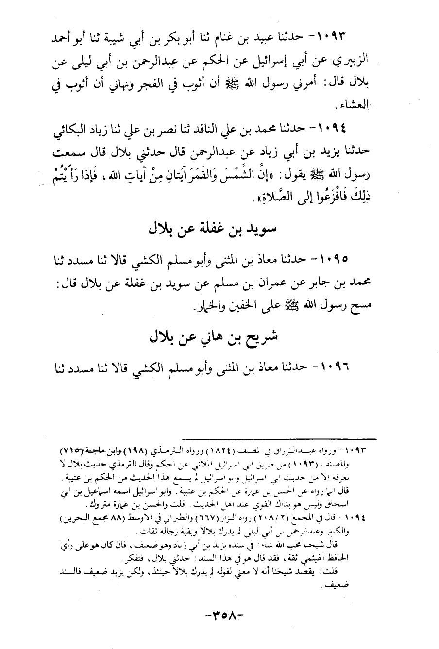 1096 - حَدَّثَنَا مُعَاذُ بْنُ الْمُثَنَّى، وَأَبُو مُسْلِمٍ الْكَشِّيُّ، قَالَا: ثنا مُسَدَّدٌ، ثنا مُعْتَمِرٌ، عَنْ لَيْثٍ، عَنِ الْحَكَمِ، وَحَبِيبِ بْنِ أَبِي ثَابِتٍ، عَنْ شُرَيْحِ بْنِ هَانِئٍ، عَنْ بِلَالٍ «أَنَّ رَسُولَ اللهِ صَلَّى اللهُ عَلَيْهِ وَسَلَّمَ §مَسَحَ عَلَى الْخُفَّيْنِ، وَالْخِمَارِ»