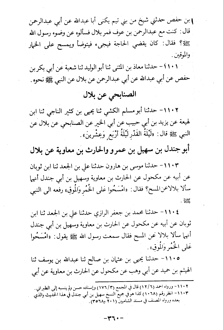 1103 - حَدَّثَنَا مُوسَى بْنُ هَارُونَ، حَدَّثَنَا عَلِيُّ بْنُ الْجَعْدِ، ثنا ابْنُ ثَوْبَانَ، عَنْ أَبِيهِ، عَنْ مَكْحُولٍ، عَنِ الْحَارِثِ بْنِ مُعَاوِيَةَ، وَسُهَيْلِ بْنِ أَبِي جَنْدَلٍ، أَنَّهُمَا سَأَلَا بِلَالًا عَنِ الْمَسْحِ، فَقَالَ: «§امْسَحُوا عَلَى الْخُمُرِ وَالْمُوقِ» رَفَعَهُ إِلَى النَّبِيِّ صَلَّى اللهُ عَلَيْهِ وَسَلَّمَ