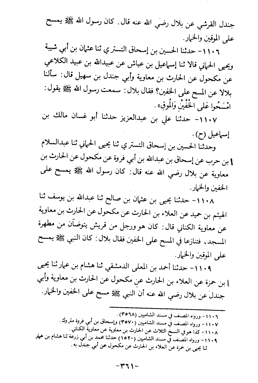 1106 - حَدَّثَنَا الْحُسَيْنُ بْنُ إِسْحَاقَ التُّسْتَرِيُّ، ثنا عُثْمَانُ بْنُ أَبِي شَيْبَةَ، وَيَحْيَى الْحِمَّانِيُّ، قَالَا: ثنا إِسْمَاعِيلُ بْنُ عَيَّاشٍ، عَنْ عُبَيْدِ اللهِ بْنِ عُبَيْدٍ الْكَلَاعِيِّ، عَنْ مَكْحُولٍ، عَنِ الْحَارِثِ بْنِ مُعَاوِيَةَ، وَأَبِي جَنْدَلِ بْنِ سُهَيْلٍ، قَالَ: سَأَلْنَا بِلَالًا عَنِ الْمَسْحِ عَلَى الْخُفَّيْنِ، فَقَالَ بِلَالٌ: سَمِعْتُ رَسُولَ اللهِ صَلَّى اللهُ عَلَيْهِ وَسَلَّمَ يَقُولُ: «§امْسَحُوا عَلَى الْخُفَّيْنِ، وَالْمُوقِ»