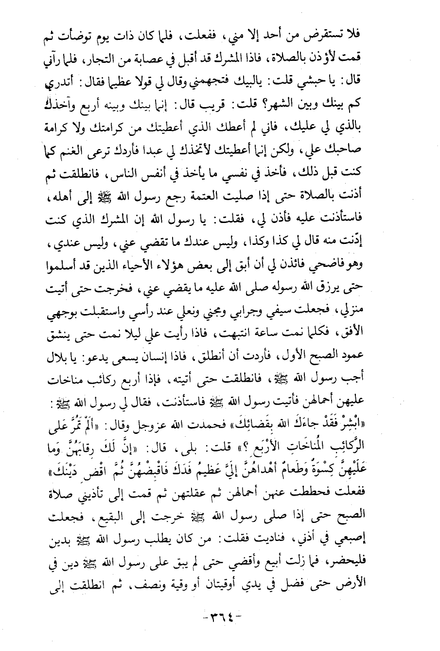 فَفَعَلْتُ ، فَلَمَّا كَانَ ذَاتَ يَوْمٍ تَوَضَّأْتُ ، ثُمَّ قُمْتُ لأُؤَذِّنَ بِالصَّلاَةِ ، فَإِذَا الْمُشْرِكُ قَدْ أَقْبَلَ فِي عِصَابَةٍ مِنَ التُّجَّارِ ، فَلَمَّا رَآنِي قَالَ : يَا حَبَشِيُّ ، قُلْتُ : يَا لَبَّيْكَ ، فَتَجَهَّمَنِي ، وَقَالَ لِي قَوْلاً عَظِيمًا ، فَقَالَ : أَتَدْرِي كَمْ بَيْنَكَ وَبَيْنَ الشَّهْرِ ، قُلْتُ : قَرِيبٌ ، قَالَ : إِنَّمَا بَيْنَكَ وَبَيْنَهُ أَرْبَعٌ ، وَآخُذُكَ بِالَّذِي لِي عَلَيْكَ ، فَإِنِّي لَمْ أُعْطِكَ الَّذِي أَعْطَيْتُكَ مِنْ كَرَامَتِكَ ، وَلاَ كَرَامَةِ صَاحِبِكَ عَلَيَّ ، وَلَكِنْ إِنَّمَا أَعْطَيْتُكَ لأَتَّخِذَكَ لِي عَبْدًا ، فَأَرُدُّكَ تَرْعَى الْغَنَمَ كَمَا كُنْتَ قَبْلَ ذَلِكَ ، فَأَخَذَ فِي نَفْسِي مَا يَأْخُذُ فِي أَنْفُسِ النَّاسِ ، فَانْطَلَقْتُ ، ثُمَّ أَذَّنْتُ بِالصَّلاَةِ حَتَّى إِذَا صَلَّيْتُ الْعَتَمَةَ ، رَجَعَ رَسُولُ اللهِ صَلَّى اللَّهُ عَلَيْهِ وَسَلَّمَ إِلَى أَهْلِهِ ، فَاسْتَأْذَنْتُ عَلَيْهِ فَأَذِنَ لِي ، فَقُلْتُ : يَا رَسُولَ اللهِ ، إِنَّ الْمُشْرِكَ الَّذِي كُنْتُ ادَّنْتُ مِنْهُ ، قَالَ لِي كَذَا وَكَذَا ، وَلَيْسَ عِنْدَكَ مَا تَقْضِي عَنِّي ، وَلَيْسَ عِنْدِي ، وَهُوَ فَاضِحِي ، فَائْذَنْ لِي أَنْ آبَقَ إِلَى بَعْضِ هَؤُلاَءِ الأَحْيَاءِ الَّذِينَ قَدْ أَسْلَمُوا حَتَّى يَرْزُقَ اللَّهُ رَسُولَهُ صَلَّى اللَّهُ عَلَيْهِ وَسَلَّمَ مَا يَقْضِي عَنِّي ، فَخَرَجْتُ حَتَّى أَتَيْتُ مَنْزِلِي ، فَجَعَلْتُ سَيْفِي وَجِرَابِي وَمِجَنِّي وَنَعْلِي عِنْدَ رَأْسِي ، وَاسْتَقْبَلْتُ بِوَجْهِي الأُفُقَ ، فَكُلَّمَا نِمْتُ سَاعَةً انْتَبَهْتُ ، فَإِذَا رَأَيْتُ عَلَيَّ لَيْلاً نِمْتُ ، حَتَّى يَنْشَقَّ عَمُودُ الصُّبْحِ الأَوَّلِ ، فَأَرَدْتُ أَنْ أَنْطَلِقَ ، فَإِذَا إِنْسَانٌ يَسْعَى يَدْعُو : يَا بِلاَلُ أَجِبْ رَسُولَ اللهِ صَلَّى اللَّهُ عَلَيْهِ وَسَلَّمَ ، فَانْطَلَقْتُ حَتَّى أَتَيْتُهُ فَإِذَا أَرْبَعُ رَكَائِبَ مُنَاخَاتٌ عَلَيْهِنِّ أَحْمَالُهُنُّ ، فَأَتَيْتُ رَسُولَ اللهِ صَلَّى اللَّهُ عَلَيْهِ وَسَلَّمَ فَاسْتَأْذَنْتُ ، فَقَالَ لِي رَسُولُ اللهِ صَلَّى اللَّهُ عَلَيْهِ وَسَلَّمَ : أَبْشِرْ ، فَقَدْ جَاءَكَ اللَّهُ بِقَضَائِكَ فَحَمِدْتُ اللَّهَ عَزَّ وَجَلَّ ، وَقَالَ : أَلَمْ تَمُرَّ عَلَى الرَّكَائِبِ الْمُنَاخَاتِ الأَرْبَعِ ؟ قُلْتُ : بَلَى ، قَالَ : إِنَّ لَكَ رِقَابَهُنَّ ، وَمَا عَلَيْهِنَّ كِسْوَةٌ وَطَعَامٌ أَهْدَاهُنَّ إِلَيَّ عَظِيمُ فَدَكَ ، فَاقْبِضْهُنَّ ثُمَّ اقْضِ دَيْنَكَ فَفَعَلْتُ ، فَحَطَطْتُ عَنْهُنَّ أَحْمَالَهُنَّ ، ثُمَّ عَقَلْتُهُنَّ ، ثُمَّ قُمْتُ إِلَى تَأْذِينِي صَلاَةَ الصُّبْحِ حَتَّى إِذَا صَلَّى رَسُولُ اللهِ صَلَّى اللَّهُ عَلَيْهِ وَسَلَّمَ خَرَجْتُ إِلَى الْبَقِيعِ ، فَجَعَلْتُ إِصْبَعَيَّ فِي أُذُنِيَّ ، فَنَادَيْتُ ، فَقُلْتُ : مَنْ كَانَ يَطْلُبُ رَسُولَ اللهِ صَلَّى اللَّهُ عَلَيْهِ وَسَلَّمَ بِدَيْنٍ فَلْيَحْضُرْ