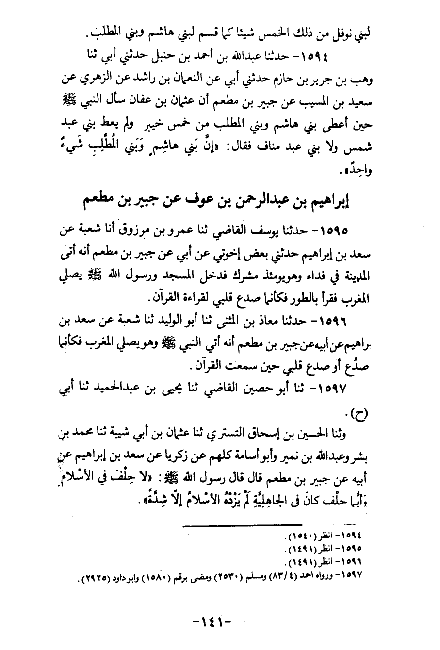 1597 - ثنا أَبُو حُصَيْنٍ الْقَاضِي، ثنا يَحْيَى بْنُ عَبْدِ الْحَمِيدِ، ثنا أَبِي ح، وَثَنَا الْحُسَيْنُ بْنُ إِسْحَاقَ التُّسْتَرِيُّ، ثنا عُثْمَانُ بْنُ أَبِي شَيْبَةَ، ثنا مُحَمَّدُ بْنُ بِشْرٍ، وَعَبْدُ اللهِ بْنُ نُمَيْرٍ، وَأَبُو أُسَامَةَ، كُلُّهُمْ عَنْ زَكَرِيَّا، عَنْ سَعْدِ بْنِ إِبْرَاهِيمَ، عَنْ أَبِيهِ، عَنْ جُبَيْرِ بْنِ مُطْعِمٍ، قَالَ: قَالَ رَسُولُ اللهِ صَلَّى اللهُ عَلَيْهِ وَسَلَّمَ: «§لَا حِلْفَ فِي الْإِسْلَامِ، وَأَيُّمَا حِلْفٍ كَانَ فِي الْجَاهِلِيَّةِ، لَمْ يَزِدْهُ الْإِسْلَامُ إِلَّا شِدَّةً»