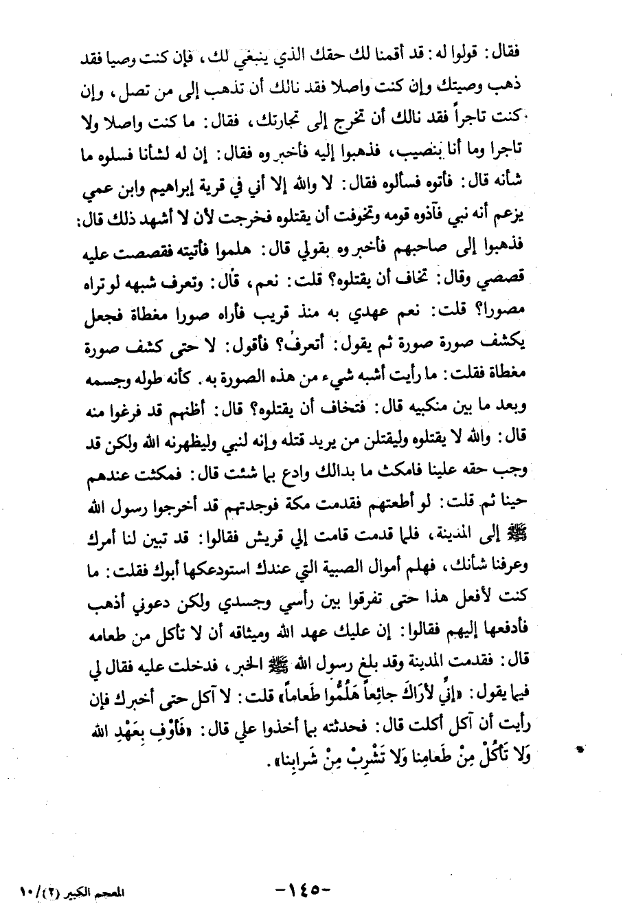 قَالَ : فَذَهَبُوا إِلَى صَاحِبِهِمْ ، فَأَخْبَرُوهُ بِقَوْلِي قَالَ : هَلُمُّوا ، فَأَتَيْتُهُ فَقَصَصْتُ عَلَيْهِ ، قَصَصِي ، وَقَالَ : تَخَافُ أَنْ يَقْتُلُوهُ ؟ قُلْتُ : نَعَمْ قَالَ : وَتَعْرِفُ شَبَهَهُ لَوْ تَرَاهُ مُصَوَّرًا ؟ قُلْتُ : نَعَمْ ، عَهْدِي بِهِ مُنْذُ قَرِيبٍ ، فَأَرَاهُ صُوَرًا مُغَطَّاةً ، فَجَعَلَ يَكْشِفُ صُورَةً صُورَةً ، ثُمَّ يَقُولُ : أَتَعْرِفُ ؟ فَأَقُولُ : لاَ ، حَتَّى كَشَفَ صُورَةً مُغَطَّاةً ، فَقُلْتُ : مَا رَأَيْتُ أَشْبَهَ شَيْءٍ مِنْ هَذِهِ الصُّورَةِ بِهِ ، كَأَنَّهُ طُولُهُ ، وجِسْمُهُ ، وَبَعْدَ مَا بَيَّنَ مَنْكِبَيْهِ ، قَالَ : قَالَ : فَتَخَافُ أَنْ يَقْتُلُوهُ ؟ قَالَ : أَظُنُّهُمْ قَدْ فَرَغُوا مِنْهُ ، قَالَ : وَاللَّهِ لاَ يَقْتُلُوهُ ، وَلَيَقْتُلَنَّ مَنْ يُرِيدُ قَتْلَهُ ، وَإِنَّهُ لِنَبِيٌّ ، ولَيُظْهِرَنَّهُ اللَّهُ ، وَلَكِنْ قَدْ وَجَبَ حَقُّهُ عَلَيْنَا ، فَامْكُثْ مَا بَدَا لَكَ وَادْعُ بِمَا شِئْتَ ، قَالَ : فَمَكَثْتُ عِنْدَهُمْ حِينًا ثُمَّ ، قُلْتُ : لَوْ أَطَعْتُهُمْ ، فَقَدِمْتُ مَكَّةَ ، فَوَجَدْتُهُمْ قَدْ أَخْرَجُوا رَسُولَ اللهِ صَلَّى اللَّهُ عَلَيْهِ وَسَلَّمَ إِلَى الْمَدِينَةِ ، فَلَمَّا قَدِمْتُ ، قَامَتْ إِلَيَّ قُرَيْشٌ ، فَقَالُوا : قَدْ تَبَيَّنَ لَنَا أَمْرُكَ ، وَعَرَفْنَا شَأْنَكَ ، فَهَلُمَّ أَمْوَالَ الصِّبْيَةِ الَّتِي عِنْدَكَ أَسْتَوْدَعَكَهَا أَبُوكَ ؟ فَقُلْتُ : مَا كُنْتُ لأَفْعَلُ هَذَا حَتَّى تُفَرِّقُوا بَيْنَ رَأْسِي ، وجَسَدِي ، وَلَكِنْ دَعُونِي أَذْهِبُ فأَدْفَعُها إِلَيْهِمْ ، فَقَالُوا : إِنَّ عَلَيْكَ عَهْدَ اللهِ ، وَمِيثَاقَهُ أَنْ لاَ تَأْكُلَ مِنْ طَعَامِهِ قَالَ : فَقَدِمْتُ الْمَدِينَةَ ، وَقَدْ بَلَغَ رَسُولَ اللهِ صَلَّى اللَّهُ عَلَيْهِ وَسَلَّمَ الْخَبَرُ ، فَدَخَلْتُ عَلَيْهِ ، فَقَالَ لِي فِيمَا يَقُولُ : إِنِّي لأَرَاكَ جَائِعًا ، هَلُمُّوا طَعَامًا ، قُلْتُ : لاَ آكُلُ حَتَّى أُخْبِرَكَ ، فَإِنْ رَأَيْتَ أَنْ آكُلَ أَكَلْتُ ، قَالَ : فَحَدَّثْتُهُ بِمَا أَخَذُوا عَلَيَّ ، قَالَ : فَأَوْفِ بِعَهْدِ اللهِ ، وَلاَ تَأْكُلْ مِنْ طَعَامِنَا ، وَلاَ تَشْرَبْ مِنْ شَرَابِنَا.