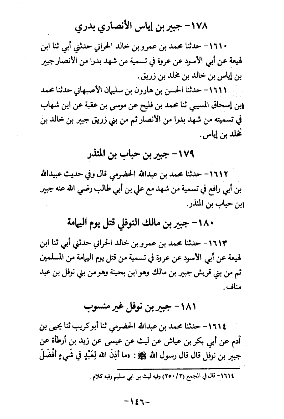 1611 - حَدَّثَنَا الْحَسَنُ بْنُ هَارُونَ بْنِ سُلَيْمَانَ الْأَصْبَهَانِيُّ، حَدَّثَنَا مُحَمَّدُ بْنُ إِسْحَاقَ الْمُسَيَّبِيُّ، ثنا مُحَمَّدُ بْنُ فُلَيْحٍ، عَنْ مُوسَى بْنِ عُقْبَةَ، عَنِ ابْنِ شِهَابٍ: «فِي تَسْمِيَتِهِ §مَنْ شَهِدَ بَدْرًا، مِنَ الْأَنْصَارِ، ثُمَّ مِنْ بَنِي زُرَيْقٍ، جُبَيْرُ بْنُ خَالِدِ بْنِ مَخْلَدِ بْنِ إِيَاسٍ»