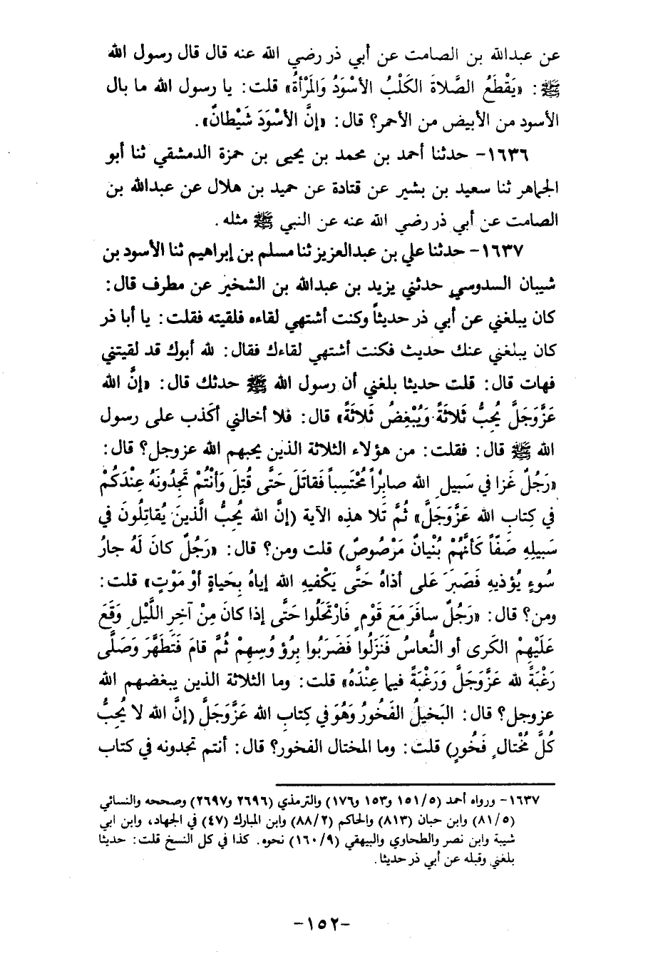 1637 - حَدَّثَنَا عَلِيُّ بْنُ عَبْدِ الْعَزِيزِ، ثنا مُسْلِمُ بْنُ إِبْرَاهِيمَ، ثنا الْأَسْوَدُ بْنُ شَيْبَانَ السَّدُوسِيُّ، حَدَّثَنِي يَزِيدُ بْنُ عَبْدِ اللهِ بْنِ الشِّخِّيرِ، عَنْ مُطَرِّفٍ، قَالَ: كَانَ يَبْلُغُنِي، عَنْ أَبِي ذَرٍّ حَدِيثٌ فَكُنْتُ أَشْتَهِي لِقَاءَهُ، فَلَقِيتُهُ، فَقُلْتُ: يَا أَبَا ذَرًّ كَانَ يَبْلُغُنِي عَنْكَ حَدِيثٌ، فَكُنْتُ أَشْتَهِي لِقَاءَكَ، فَقَالَ: لِلَّهِ أَبُوكَ فَقَدْ لَقِيتَنِي فهاتِ، قَالَ: قُلْتُ: حَدِيثًا بَلَغَنِي أَنَّ رَسُولَ اللهِ صَلَّى اللهُ عَلَيْهِ وَسَلَّمَ حَدَّثَكَ قَالَ: «إِنَّ §اللهَ عَزَّ وَجَلَّ يُحِبُّ ثَلَاثَةً، وَيُبْغِضُ ثَلَاثَةً» ، قَالَ: فَلَا أَخَالُنِي أَكْذَبُ عَلَى رَسُولِ اللهِ صَلَّى اللهُ عَلَيْهِ وَسَلَّمَ قَالَ: فَقُلْتُ: مَنْ هَؤُلَاءِ الثَّلَاثَةُ الَّذِينَ يُحِبُّهُمُ اللهُ عَزَّ وَجَلَّ؟، قَالَ: «رَجُلٌ غَزَا فِي سَبِيلِ اللهِ صَابِرًا، مُحْتَسِبًا، فَقَاتَلَ حَتَّى قُتِلَ، وَأَنْتُمْ تَجِدُونَهُ عِنْدَكُمْ فِي كِتَابِ اللهِ عَزَّ وَجَلَّ» ، ثُمَّ تَلَا هَذِهِ الْآيَةَ: {إِنَّ اللهَ يُحِبُّ الَّذِينَ يُقَاتِلُونَ فِي سَبِيلِهِ صَفًّا، كَأَنَّهُمْ بُنْيَانٌ مَرْصُوصٌ} [الصف: 4] ، قُلْتُ: وَمَنْ؟ قَالَ: «رَجُلٌ كَانَ لَهُ جَارُ سُوءٍ، يُؤْذِيهِ، فَصَبَرَ عَلَى أَذَاهُ، حَتَّى يَكْفِيَهُ اللهُ إِيَّاهُ بِحَيَاةٍ، أَوْ مَوْتٍ» ، قُلْتُ: وَمَنْ؟، قَالَ: «رَجُلٌ سَافَرَ مَعَ قَوْمٍ، فَارْتَحَلُوا، حَتَّى إِذَا كَانَ مِنْ آخِرِ اللَّيْلِ وَقَعَ عَلَيْهِمُ الْكَرَى، أَوِ النُّعَاسُ، فَنَزَلُوا، فَضَرَبُوا بِرُءُوسِهمْ، ثُمَّ قَامَ، فَتَطَهَّرَ، وَصَلَّى رَغْبَةً لِلَّهِ عَزَّ وَجَلَّ، وَرَغْبَةً فِيمَا عِنْدَهُ» ، قُلْتُ: وَمَا الثَّلَاثَةُ الَّذِينَ يُبْغِضُهُمُ اللهُ عَزَّ وَجَلَّ؟ قَالَ: " الْبَخِيلُ الْفَخُورُ، وَهُوَ فِي كِتَابِ اللهِ عَزَّ وَجَلَّ {إِنَّ اللهَ لَا يُحِبُّ كُلَّ مُخْتَالٍ فَخُورٍ} [لقمان: 18] "، قُلْتُ: وَمَا الْمُخْتَالُ الْفَخُورُ؟ قَالَ: «أَنْتُمْ تَجِدُونَهُ فِي كِتَابِ اللهِ عَزَّ وَجَلَّ، الْبَخِيلَ الْمُخْتَالَ» قُلْتُ: وَمَنْ؟ قَالَ: " التَّاجِرُ الْحَلَّافُ أَوِ الْبَائِعُ الْحَلَّافُ، قَالَ: لَا أَدْرِي أَيَّهُمَا، قَالَ أَبُو ذَرٍّ "، قُلْتُ: يَا أَبَا ذَرًّ مَا الْمَالُ؟، قَالَ: فَرَقٌ لَنَا وَذَوْدٌ، قُلْتُ: يَا أَبَا ذَرًّ، لَيْسَ عَنْ هَذَا أَسْأَلُكَ، إِنَّمَا أَسْأَلُكَ عَنْ صَامِتِ الْمَالِ، قَالَ: مَا أَصْبَحَ لَا أَمْسَى، وَمَا أَمْسَى لَا أَصْبَحَ، قُلْتُ: مَا لَكَ ولِأَخْوَانِكَ مِنْ قُرَيْشٍ؟، قَالَ: وَاللهِ لَا أَسْتَفْتِيهِمْ عَنْ دِينٍ، وَلَا أَسْأَلُهُمْ دُنْيَا حَتَّى أَلْقَى اللهَ وَرَسُولَهُ، قَالَهَا ثَلَاثَ مَرَّاتٍ