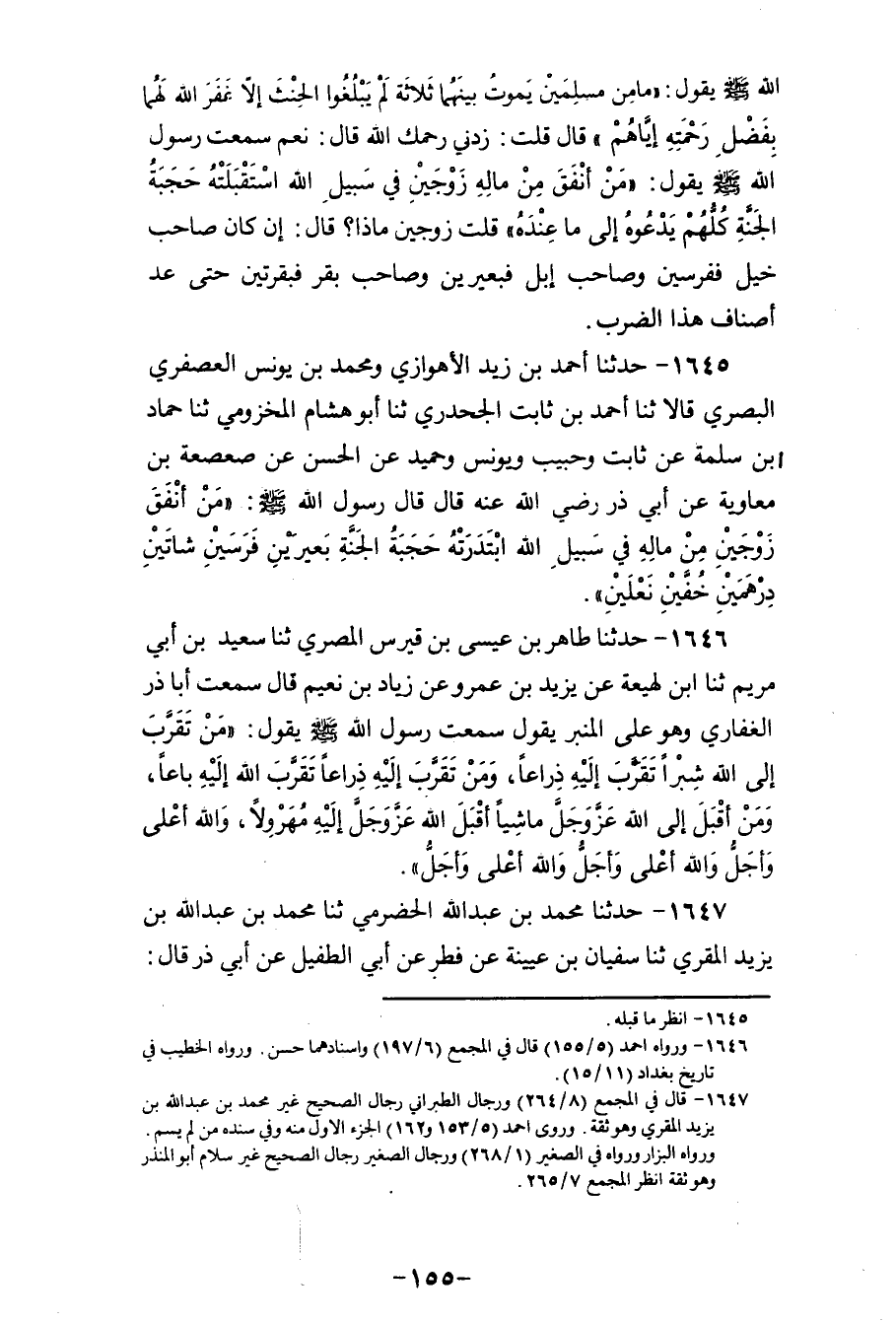 1645 - حَدَّثَنَا أَحْمَدُ بْنُ زَيْدٍ الْأَهْوَازِيُّ، وَمُحَمَّدُ بْنُ يُونُسَ الْعُصْفُرِيُّ الْبَصْرِيُّ، قَالَا: ثنا أَحْمَدُ بْنُ ثَابِتٍ الْجَحْدَرِيُّ، ثنا أَبُو هِشَامٍ الْمَخْزُومِيُّ، ثنا حَمَّادُ بْنُ سَلَمَةَ، عَنْ ثَابِتٍ، وَحَبِيبٍ، وَيُونُسَ، وَحُمَيْدٍ، عَنِ الْحَسَنِ، عَنْ صَعْصَعَةَ بْنِ مُعَاوِيَةَ، عَنْ أَبِي ذَرٍّ رَضِي اللهُ عَنْهُ، قَالَ: قَالَ رَسُولُ اللهِ صَلَّى اللهُ عَلَيْهِ وَسَلَّمَ: «§مَنْ أَنْفَقَ زَوْجَيْنِ مِنْ مَالِهِ فِي سَبِيلِ اللهِ، ابْتَدَرَتْهُ حَجَبَةُ الْجَنَّةِ، بَعِيرَيْنِ فَرَسَيْنِ، شَاتَيْنِ دِرْهَمَيْنِ، خُفَّيْنِ نَعْلَيْنِ»