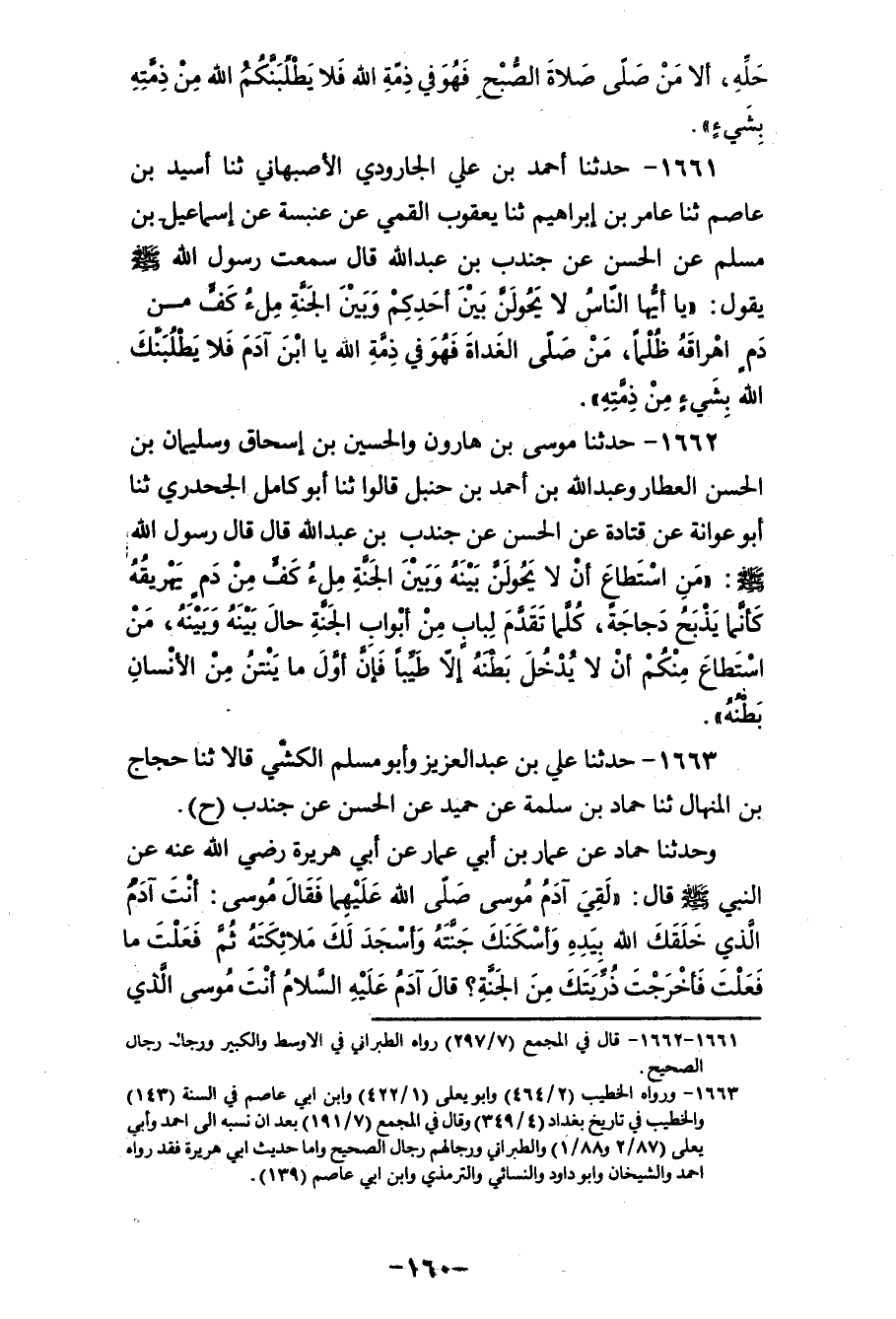 1661 - حَدَّثَنَا أَحْمَدُ بْنُ عَلِيٍّ الْجَارُودِيُّ الْأَصْبَهَانِيُّ، ثنا أُسَيْدُ بْنُ عَاصِمٍ، ثنا عَامِرُ بْنُ إِبْرَاهِيمَ، ثنا يَعْقُوبُ الْقُمِّيُّ، عَنْ عَنْبَسَةَ، عَنْ إِسْمَاعِيلَ بْنِ مُسْلِمٍ، عَنِ الْحَسَنِ، عَنْ جُنْدُبِ بْنِ عَبْدِ اللهِ، قَالَ: سَمِعْتُ رَسُولَ اللهِ صَلَّى اللهُ عَلَيْهِ وَسَلَّمَ يَقُولُ: «يَا أَيُّهَا النَّاسُ لَا يَحُولَنَّ بَيْنَ أَحَدِكُمْ وَبَيْنَ الْجَنَّةِ مِلْءُ كَفٍّ مِنْ دَمٍ أَهْرَاقَهُ ظُلْمًا، §مَنْ صَلَّى الْغَدَاةَ فَهُوَ فِي ذِمَّةِ اللهِ، يَا ابْنَ آدَمَ فَلَا يَطْلُبَنَّكَ اللهُ بِشَيْءٍ مِنْ ذِمَّتِهِ»