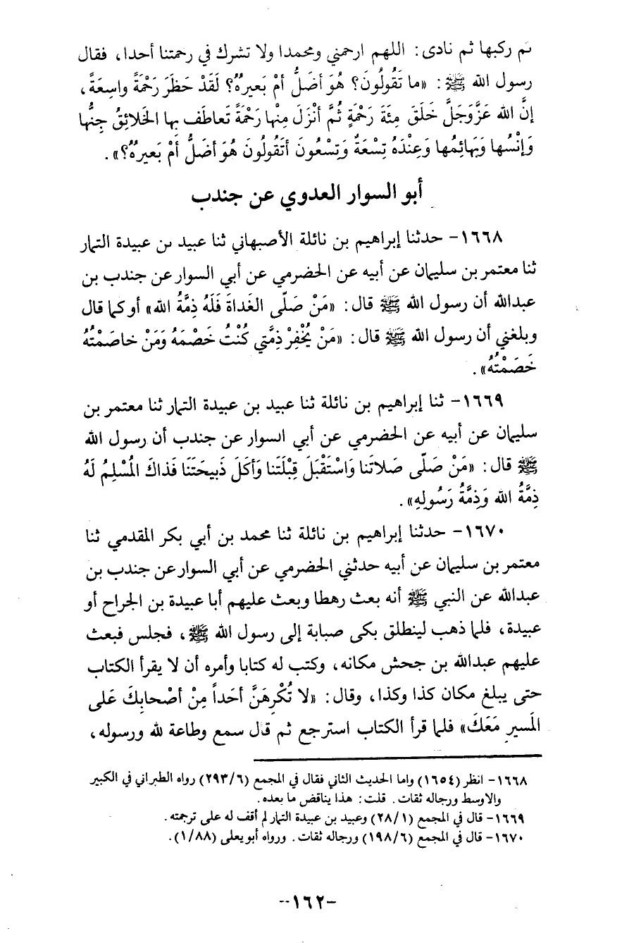 1668 - حَدَّثَنَا إِبْرَاهِيمُ بْنُ نَائِلَةَ الْأَصْبَهَانِيُّ، ثنا عُبَيْدُ بْنُ عُبَيْدَةَ التَّمَّارُ، ثنا مُعْتَمِرُ بْنُ سُلَيْمَانَ، عَنْ أَبِيهِ، عَنِ الْحَضْرَمِيِّ، عَنْ أَبِي السَّوَّارِ، عَنْ جُنْدُبِ بْنِ عَبْدِ اللهِ، أَنَّ رَسُولَ اللهِ صَلَّى اللهُ عَلَيْهِ وَسَلَّمَ قَالَ: «§مَنْ صَلَّى الْغَدَاةَ فلَهُ ذِمَّةُ اللهِ»