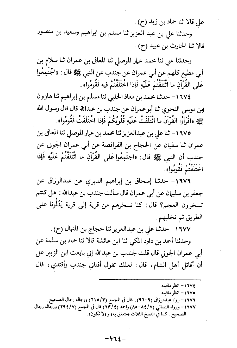 1675 - حَدَّثَنَا عَلِيُّ بْنُ عَبْدِ الْعَزِيزِ، ثنا مُحَمَّدُ بْنُ عَمَّارٍ الْمَوْصِلِيُّ، ثنا الْمُعَافَى بْنُ عِمْرَانَ، ثنا سُفْيَانُ، عَنِ الْحَجَّاجِ بْنِ الْفُرَافِصَةِ، عَنْ أَبِي عِمْرَانَ الْجَوْنِيِّ، عَنْ جُنْدُبٍ، أَنَّ النَّبِيَّ صَلَّى اللهُ عَلَيْهِ وَسَلَّمَ قَالَ: «§اجْتَمِعُوا عَلَى الْقُرْآنِ مَا ائْتَلَفْتُمْ عَلَيْهِ فَإِذَا اخْتَلَفْتُمْ فَقُومُوا»