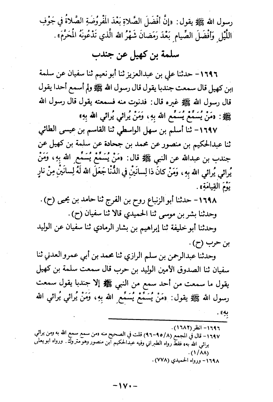 1698 - حَدَّثَنَا أَبُو الزِّنْبَاعِ رَوْحُ بْنُ الْفَرَجِ، ثنا حَامِدُ بْنُ يَحْيَى، ح وَحَدَّثَنَا بِشْرُ بْنُ مُوسَى، ثنا الْحُمَيْدِيُّ، قَالَا: ثنا سُفْيَانُ، ح وَحَدَّثَنَا أَبُو خَلِيفَةَ، ثنا إِبْرَاهِيمُ بْنُ بَشَّارٍ الرَّمَادِيُّ، ثنا سُفْيَانُ، عَنِ الْوَلِيدِ بْنِ حَرْبٍ، ح وَحَدَّثَنَا عَبْدُ الرَّحْمَنِ بْنُ سَلْمٍ الرَّازِيُّ، ثنا مُحَمَّدُ بْنُ أَبِي عَمْرٍو الْعَدَنِيُّ، ثنا سُفْيَانُ، ثنا الصَّدُوقُ الْأَمِينُ الْوَلِيدُ بْنُ حَرْبٍ، قَالَ: سَمِعْتُ سَلَمَةَ بْنَ كُهَيْلٍ، يَقُولُ: مَا سَمِعْتُ مِنْ أَحَدٍ سَمِعَ مِنَ النَّبِيِّ صَلَّى اللهُ عَلَيْهِ وَسَلَّمَ إِلَّا جُنْدُبًا، يَقُولُ: سَمِعْتُ رَسُولَ اللهِ صَلَّى اللهُ عَلَيْهِ وَسَلَّمَ يَقُولُ: «§مَنْ يُسَمِّعْ يُسَمِّعِ اللهُ بِهِ، وَمَنْ يُرَائِي يُرَائِي اللهُ بِهِ»