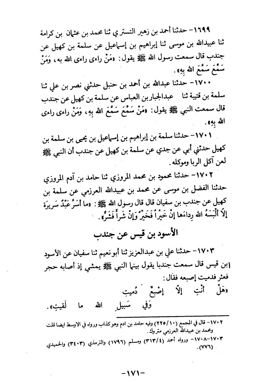 1700 - حَدَّثَنَا عَبْدُ اللهِ بْنُ أَحْمَدَ بْنِ حَنْبَلٍ، حَدَّثَنِي نَصْرُ بْنُ عَلِيٍّ، ثنا سَلَمَةُ بْنُ قُتَيْبَةَ، ثنا عَبْدُ الْجَبَّارِ بْنُ الْعَبَّاسِ، عَنْ سَلَمَةَ بْنِ كُهَيْلٍ، عَنْ جُنْدُبٍ، قَالَ: سَمِعْتُ النَّبِيَّ صَلَّى اللهُ عَلَيْهِ وَسَلَّمَ يَقُولُ: «§مَنْ سَمَّعَ سَمَّعَ اللهُ بِهِ، وَمَنْ رَاءَى رَاءَى اللهُ بِهِ»