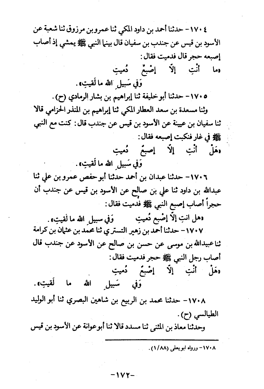 1704 - حَدَّثَنَا أَحْمَدُ بْنُ دَاوُدَ الْمَكِّيُّ، ثنا عَمْرُو بْنُ مَرْزُوقٍ، ثنا شُعْبَةُ، عَنِ الْأَسْوَدِ بْنِ قَيْسٍ، عَنْ جُنْدُبِ بْنِ سُفْيَانَ، قَالَ: بَيْنَمَا النَّبِيُّ صَلَّى اللهُ عَلَيْهِ وَسَلَّمَ يَمْشِي إِذْ أَصَابَ إِصْبَعَهُ حَجَرٌ قَالَ: فَدُمِيَتْ، فَقَالَ: «§مَا أَنْتِ إِلَّا إِصْبَعٌ دُمِيتِ وَفِي سَبِيلِ اللهِ مَا لَقِيتِ»