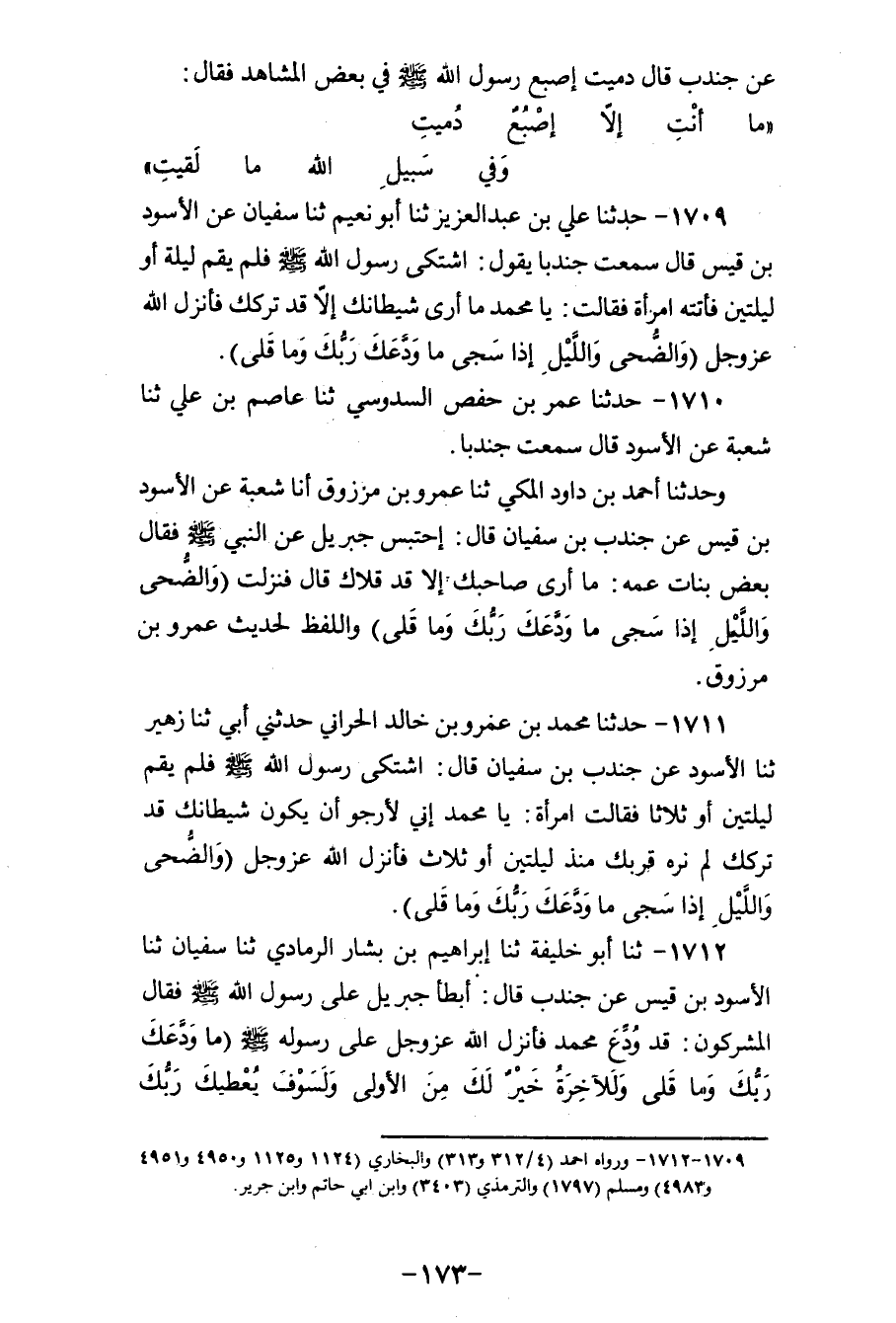 1709 - حَدَّثَنَا عَلِيُّ بْنُ عَبْدِ الْعَزِيزِ، ثنا أَبُو نُعَيْمٍ، ثنا سُفْيَانُ، عَنِ الْأَسْوَدِ بْنِ قَيْسٍ، قَالَ: سَمِعْتُ جُنْدُبًا، يَقُولُ: «§اشْتَكَى رَسُولُ اللهِ صَلَّى اللهُ عَلَيْهِ وَسَلَّمَ فَلَمْ يَقُمْ لَيْلَةً أَوْ لَيْلَتَيْنِ» فَأَتَتْهُ امْرَأَةٌ، فَقَالَتْ: يَا مُحَمَّدُ مَا رَأَى شَيْطَانُكَ إِلَّا قَدْ تَرَكَكَ، فَأَنْزَلَ اللهُ عَزَّ وَجَلَّ: {وَالضُّحَى وَاللَّيْلِ إِذَا سَجَى مَا وَدَّعَكَ رَبُّكَ وَمَا قَلَى} [الضحى: 2]