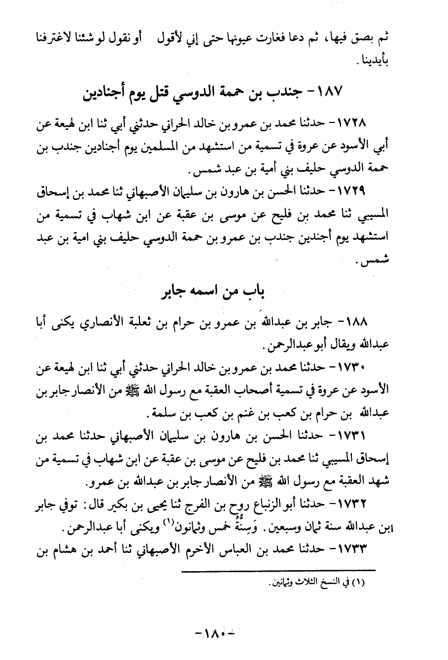 1731 - حَدَّثَنَا الْحَسَنُ بْنُ هَارُونَ بْنِ سُلَيْمَانَ الْأَصْبَهَانِيُّ، حَدَّثَنَا مُحَمَّدُ بْنُ إِسْحَاقَ الْمُسَيَّبِيُّ، ثنا مُحَمَّدُ بْنُ فُلَيْحٍ، عَنْ مُوسَى بْنِ عُقْبَةَ، عَنِ ابْنِ شِهَابٍ: «فِي §تَسْمِيَةِ مَنْ شَهِدَ الْعَقَبَةَ مَعَ رَسُولِ اللهِ صَلَّى اللهُ عَلَيْهِ وَسَلَّمَ مِنَ الْأَنْصَارِ جَابِرُ بْنُ عَبْدِ اللهِ بْنِ عَبْدِ اللهِ بْنِ عَمْرٍو»