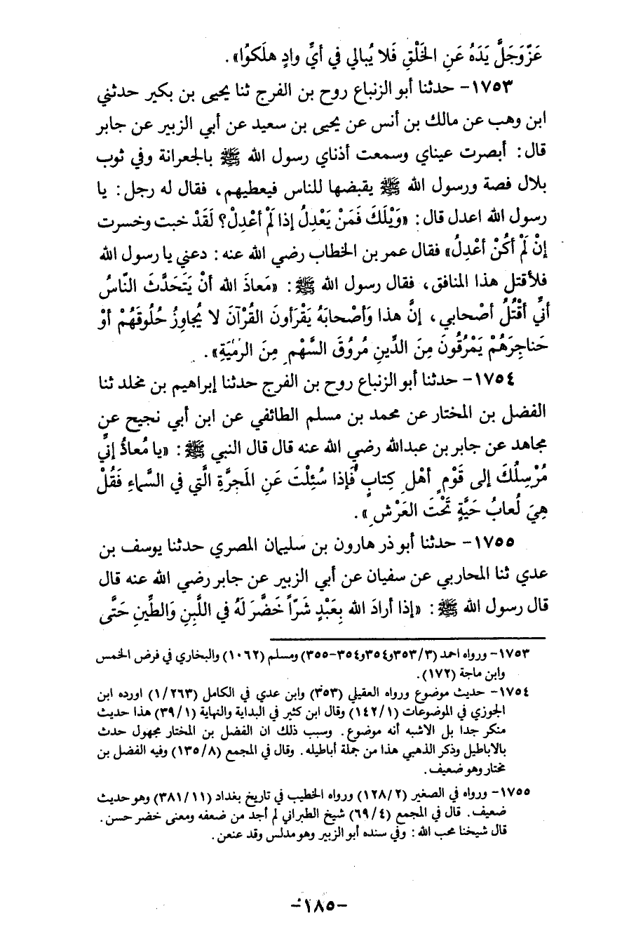 1753 - حَدَّثَنَا أَبُو الزِّنْبَاعِ رَوْحُ بْنُ الْفَرَجِ، ثنا يَحْيَى بْنُ بُكَيْرٍ، حَدَّثَنِي ابْنُ وَهْبٍ، عَنْ مَالِكِ بْنِ أَنَسٍ، عَنْ يَحْيَى بْنِ سَعِيدٍ، عَنْ أَبِي الزُّبَيْرِ، عَنْ جَابِرٍ، قَالَ: أَبْصَرَتْ عَيْنَاي وَسَمِعَتْ أُذُنَاي رَسُولَ اللهِ صَلَّى اللهُ عَلَيْهِ وَسَلَّمَ، بِالْجِعْرَانَةِ وَفِي ثَوْبِ بِلَالٍ فِضَّةٌ وَرَسُولُ اللهِ صَلَّى اللهُ عَلَيْهِ وَسَلَّمَ يَقْبِضُهَا لِلنَّاسِ فَيُعْطِيهِمْ، فَقَالَ لَهُ رَجُلٌ: يَا رَسُولَ اللهِ اعْدِلْ قَالَ: «وَيْلَكَ فَمَنْ يَعْدِلُ إِذَا لَمْ أَعْدَلْ؟ لَقَدْ خِبْتَ وَخَسِرْتَ إِنْ لَمْ أَكُنْ أَعْدَلُ» ، فَقَالَ عُمَرُ بْنُ الْخَطَّابِ رَضِيَ اللهُ عَنْهُ: دَعْنِي يَا رَسُولَ اللهِ فَلْأَقْتُلْ هَذَا الْمُنَافِقَ، فَقَالَ رَسُولُ اللهِ صَلَّى اللهُ عَلَيْهِ وَسَلَّمَ: «§مَعَاذَ اللهِ أَنْ يَتَحَدَّثَ النَّاسُ أَنِّي أَقْتُلُ أَصْحَابِي، إِنَّ هَذَا وَأَصْحَابَهُ يَقْرَءُونَ الْقُرْآنَ لَا يُجَاوِزُ حُلُوقَهُمْ أَوْ حَنَاجِرَهُمْ يَمْرُقُونَ مِنَ الدِّينِ مُرُوقَ السَّهْمِ مِنَ الرَّمِيَّةِ»