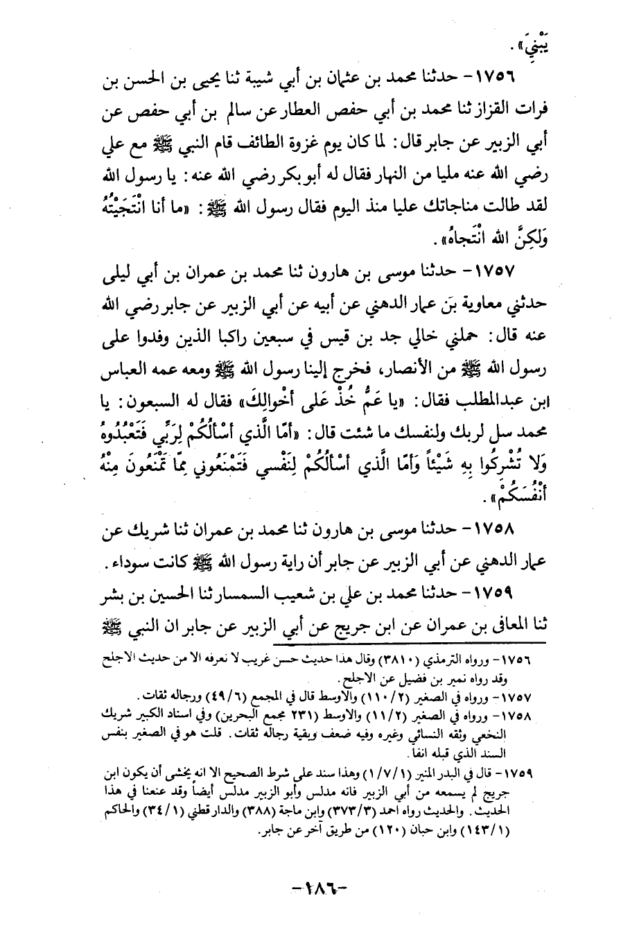 1756 - حَدَّثَنَا مُحَمَّدُ بْنُ عُثْمَانَ بْنِ أَبِي شَيْبَةَ، ثنا يَحْيَى بْنُ الْحَسَنِ بْنِ فُرَاتٍ الْقَزَّازُ، ثنا مُحَمَّدُ بْنُ أَبِي حَفْصٍ الْعَطَّارُ، عَنْ سَالِمِ بْنِ أَبِي حَفْصٍ، عَنْ أَبِي الزُّبَيْرِ، عَنْ جَابِرٍ، قَالَ: لَمَّا كَانَ يَوْمُ غَزْوَةِ الطَّائِفِ قَامَ النَّبِيُّ صَلَّى اللهُ عَلَيْهِ وَسَلَّمَ مَعَ عَلِيٍّ رَضِيَ اللهُ عَنْهُ مَلِيًّا مِنَ النَّهَارِ، فَقَالَ لَهُ أَبُو بَكْرٍ رَضِيَ اللهُ عَنْهُ: يَا رَسُولَ اللهِ لَقَدْ طَالَتْ مُنَاجَاتُكَ عَلِيًّا مُنْذُ الْيَوْمِ، فَقَالَ رَسُولُ اللهِ صَلَّى اللهُ عَلَيْهِ وَسَلَّمَ: «§مَا أَنَا انْتَجَيْتُهُ وَلَكِنَّ اللهُ انْتَجَاهُ»