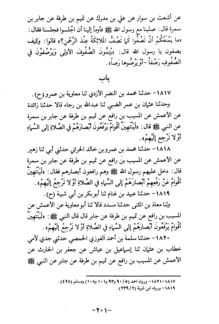 1817 - حَدَّثَنَا مُحَمَّدُ بْنُ النَّضْرِ الْأَزْدِيُّ، ثنا مُعَاوِيَةُ بْنُ عَمْرٍو، ح وَحَدَّثَنَا عُثْمَانُ بْنُ عُمَرَ الضَّبِّيُّ، ثنا عَبْدُ اللهِ بْنُ رَجَاءٍ، قَالَا: حَدَّثَنَا زَائِدَةُ، عَنِ الْأَعْمَشِ، عَنِ الْمُسَيَّبِ بْنِ رَافِعٍ، عَنْ تَمِيمِ بْنِ طَرَفَةَ، عَنْ جَابِرِ بْنِ سَمُرَةَ، عَنِ النَّبِيِّ صَلَّى اللهُ عَلَيْهِ وَسَلَّمَ قَالَ: «§لَيَنْتَهِيَنَّ أَقْوَامٌ يَرْفَعُونَ أَبْصَارَهُمْ فِي الصَّلَاةِ إِلَى السَّمَاءِ أَوْ لَا تَرْجِعُ إِلَيْهِمْ»