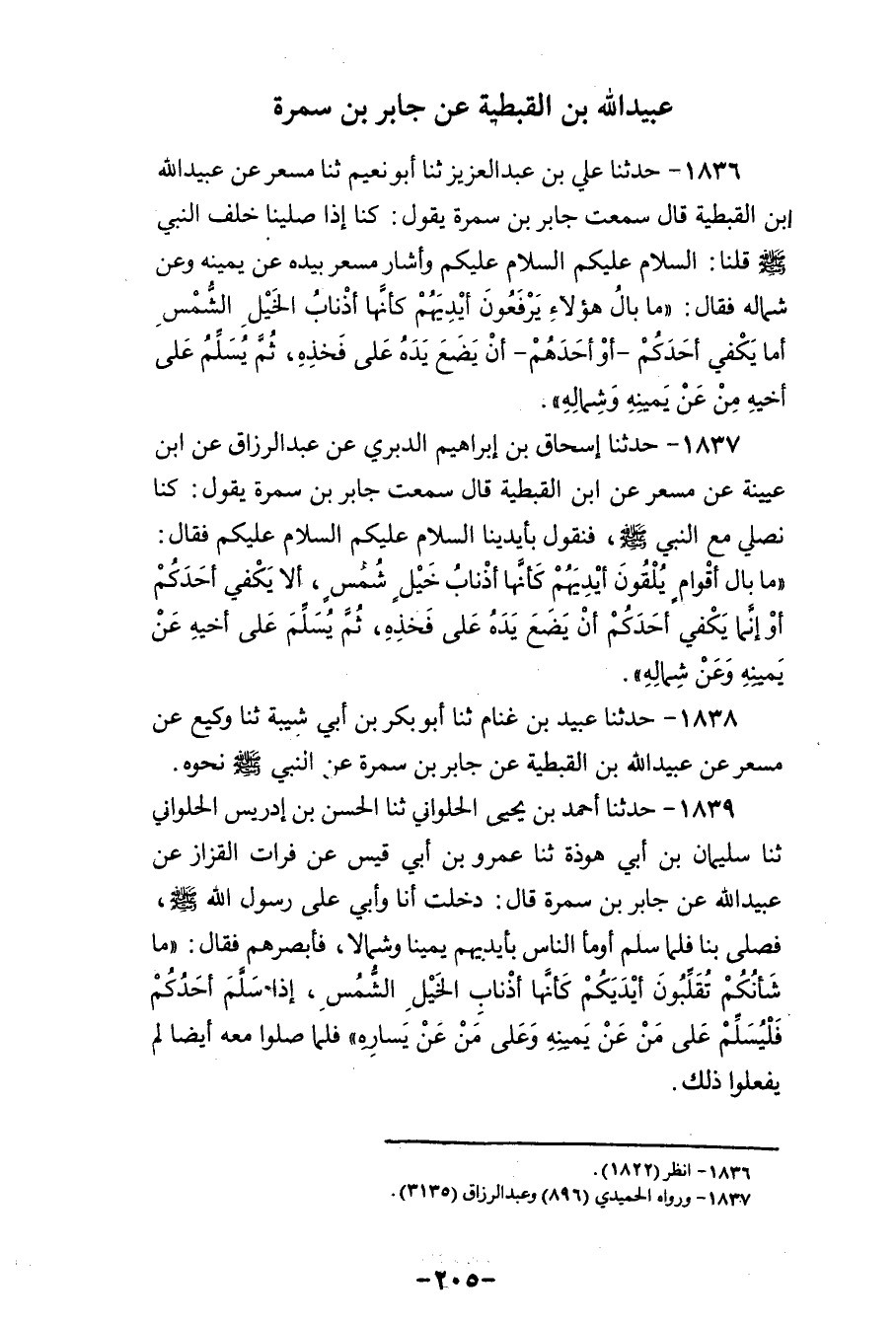 1837 - حَدَّثَنَا إِسْحَاقُ بْنُ إِبْرَاهِيمَ الدَّبَرِيُّ، عَنْ عَبْدِ الرَّزَّاقِ، عَنِ ابْنِ عُيَيْنَةَ، عَنْ مِسْعَرٍ، عَنِ ابْنِ الْقِبْطِيَّةِ، قَالَ: سَمِعْتُ جَابِرَ بْنَ سَمُرَةَ، يَقُولُ: كُنَّا نُصَلِّي مَعَ النَّبِيِّ صَلَّى اللهُ عَلَيْهِ وَسَلَّمَ فَنَقُولُ بِأَيْدِينَا: السَّلَامُ عَلَيْكُمُ، السَّلَامُ عَلَيْكُمْ، فَقَالَ: «§مَا بَالُ أَقْوَامٍ يُلْقُونَ أَيْدِيَهُمْ كَأَنَّهَا أَذْنَابُ خَيْلٍ شُمُسٍ، أَلَا يَكْفِي أَحَدَكُمْ أَوْ إِنَّمَا يَكْفِي أَحَدَكُمْ أَنْ يَضَعَ يَدَهُ عَلَى فَخِذِهِ، ثُمَّ يُسَلِّمُ عَلَى أَخِيهِ عَنْ يَمِينِهِ وَعَنْ شِمَالِهِ»