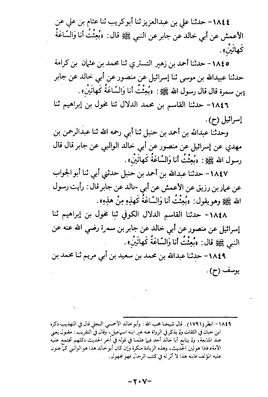 1846 - حَدَّثَنَا الْقَاسِمُ بْنُ مُحَمَّدٍ الدَّلَّالُ، ثنا مُخَوَّلُ بْنُ إِبْرَاهِيمَ، ثنا إِسْرَائِيلُ، ح وَحَدَّثَنَا عَبْدُ اللهِ بْنُ أَحْمَدَ بْنِ حَنْبَلٍ، ثنا أَبِي رَحِمَهُ اللهُ، ثنا عَبْدُ الرَّحْمَنِ بْنُ مَهْدِيٍّ، عَنْ إِسْرَائِيلَ، عَنْ مَنْصُورٍ، عَنْ أَبِي خَالِدٍ الْوَالِبِيِّ، عَنْ جَابِرٍ، قَالَ: قَالَ رَسُولُ اللهِ صَلَّى اللهُ عَلَيْهِ وَسَلَّمَ: «§بُعِثْتُ أَنَا وَالسَّاعَةُ كَهَاتَيْنِ»