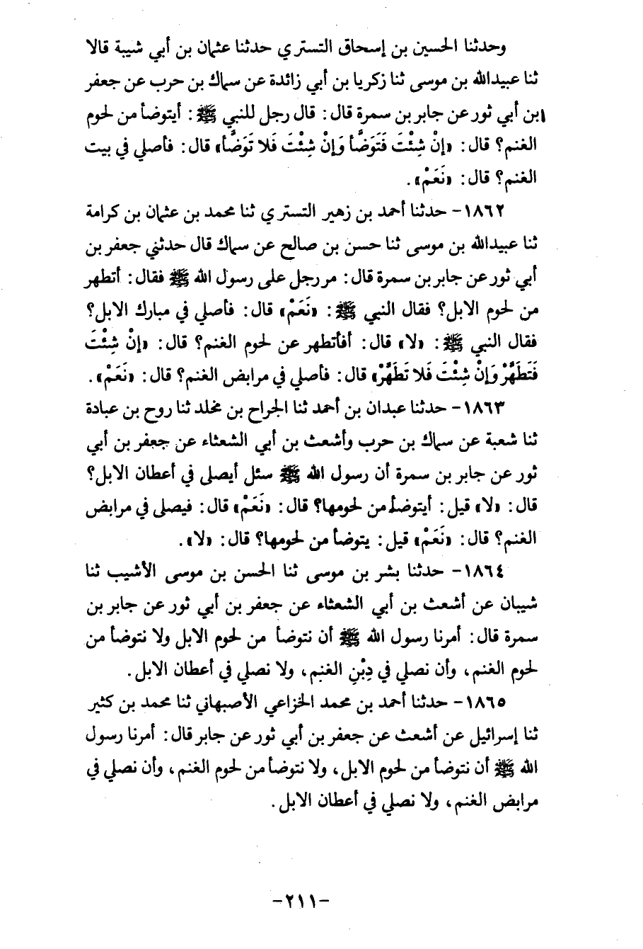 1862 - حَدَّثَنَا أَحْمَدُ بْنُ زُهَيْرٍ التُّسْتَرِيُّ، ثنا مُحَمَّدُ بْنُ عُثْمَانَ بْنِ كَرَامَةَ، ثنا عُبَيْدُ اللهِ بْنُ مُوسَى، ثنا حَسَنُ بْنُ صَالِحٍ، عَنْ سِمَاكٍ، قَالَ: حَدَّثَنِي جَعْفَرُ بْنُ أَبِي ثَوْرٍ، عَنْ جَابِرِ بْنِ سَمُرَةَ، قَالَ: مَرَّ رَجُلٌ عَلَى رَسُولِ اللهِ صَلَّى اللهُ عَلَيْهِ وَسَلَّمَ، فَقَالَ: §أَتَطَهَّرُ مِنْ لُحُومِ الْإِبِلِ؟ فَقَالَ النَّبِيُّ صَلَّى اللهُ عَلَيْهِ وَسَلَّمَ: «نَعَمْ» ، قَالَ: فَأُصَلِّي فِي مَبَارِكِ الْإِبِلِ؟ فَقَالَ النَّبِيُّ صَلَّى اللهُ عَلَيْهِ وَسَلَّمَ: «لَا» ، قَالَ: أَفَأَتَطَهَّرُ عَنْ لُحُومِ الْغَنَمِ؟ قَالَ: «إِنْ شِئْتَ فَتَطَهَّرْ وَإِنْ شِئْتَ فَلَا تَطَهَّرْ» ، قَالَ: فَأُصَلِّي فِي مَرَابِضِ الْغَنَمِ؟ قَالَ: «نَعَمْ»