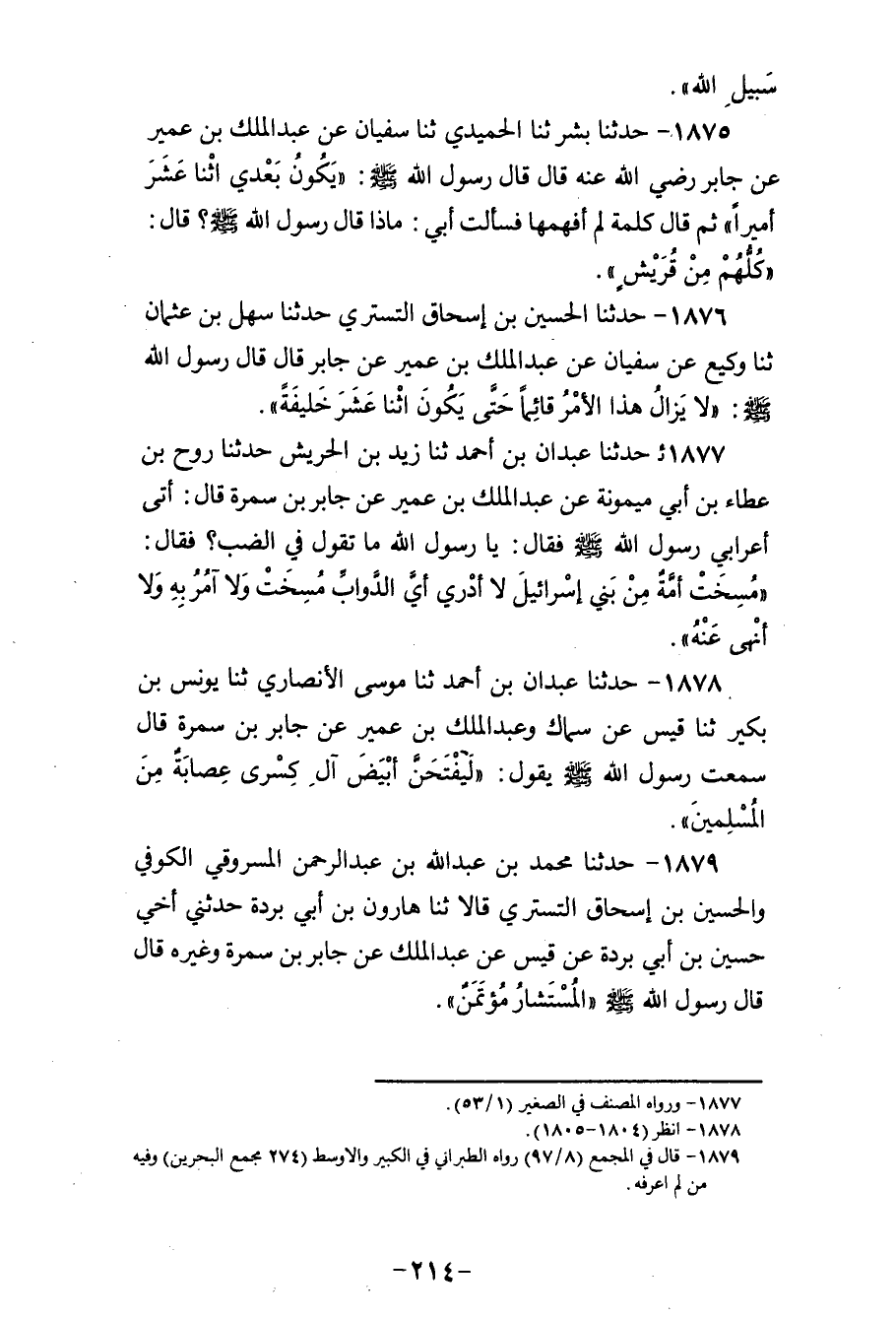 1876 - حَدَّثَنَا الْحُسَيْنُ بْنُ إِسْحَاقَ التُّسْتَرِيُّ، حَدَّثَنَا سَهْلُ بْنُ عُثْمَانَ، ثنا وَكِيعٌ، عَنْ سُفْيَانَ، عَنْ عَبْدِ الْمَلِكِ بْنِ عُمَيْرٍ، عَنْ جَابِرٍ، قَالَ: قَالَ رَسُولُ اللهِ صَلَّى اللهُ عَلَيْهِ وَسَلَّمَ: «§لَا يَزَالُ هَذَا الْأَمْرُ قَائِمًا حَتَّى يَكُونَ اثْنَا عَشَرَ خَلِيفَةً»