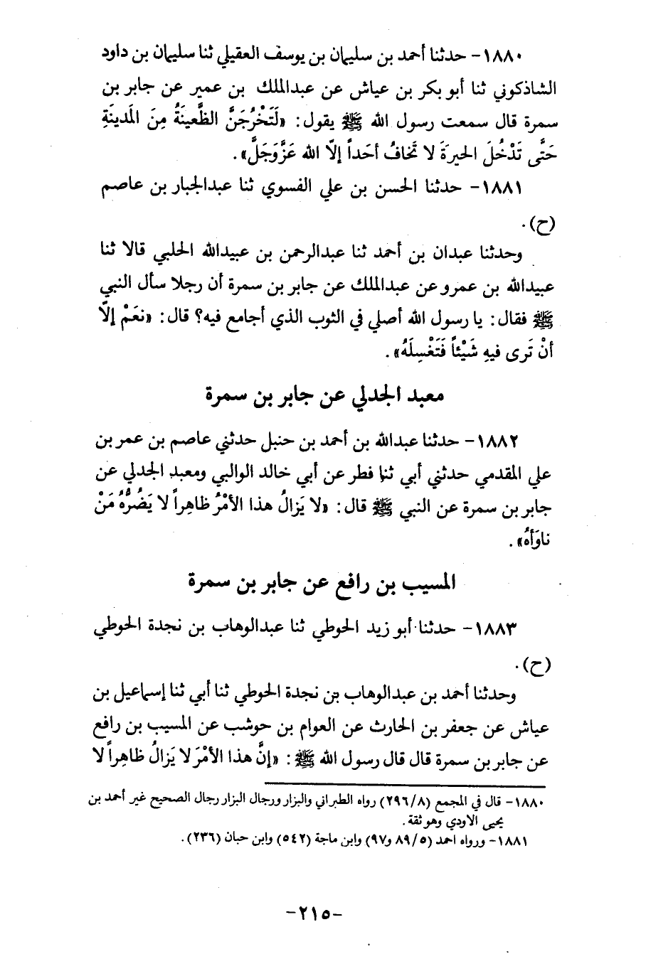 1880 - حَدَّثَنَا أَحْمَدُ بْنُ سُلَيْمَانَ بْنِ يُوسُفَ الْعُقَيْلِيُّ، ثنا سُلَيْمَانُ بْنُ دَاوُدَ الشَّاذَكُونِيُّ، ثنا أَبُو بَكْرِ بْنُ عَيَّاشٍ، عَنْ عَبْدِ الْمَلِكِ بْنِ عُمَيْرٍ، عَنْ جَابِرِ بْنِ سَمُرَةَ، قَالَ: سَمِعْتُ رَسُولَ اللهِ صَلَّى اللهُ عَلَيْهِ وَسَلَّمَ يَقُولُ: «§لَتَخْرُجَنَّ الظَّعِينَةُ مِنَ الْمَدِينَةِ حَتَّى تَدْخُلَ الْحِيرَةَ، لَا تَخَافُ أَحَدًا إِلَّا اللهَ عَزَّ وَجَلَّ»