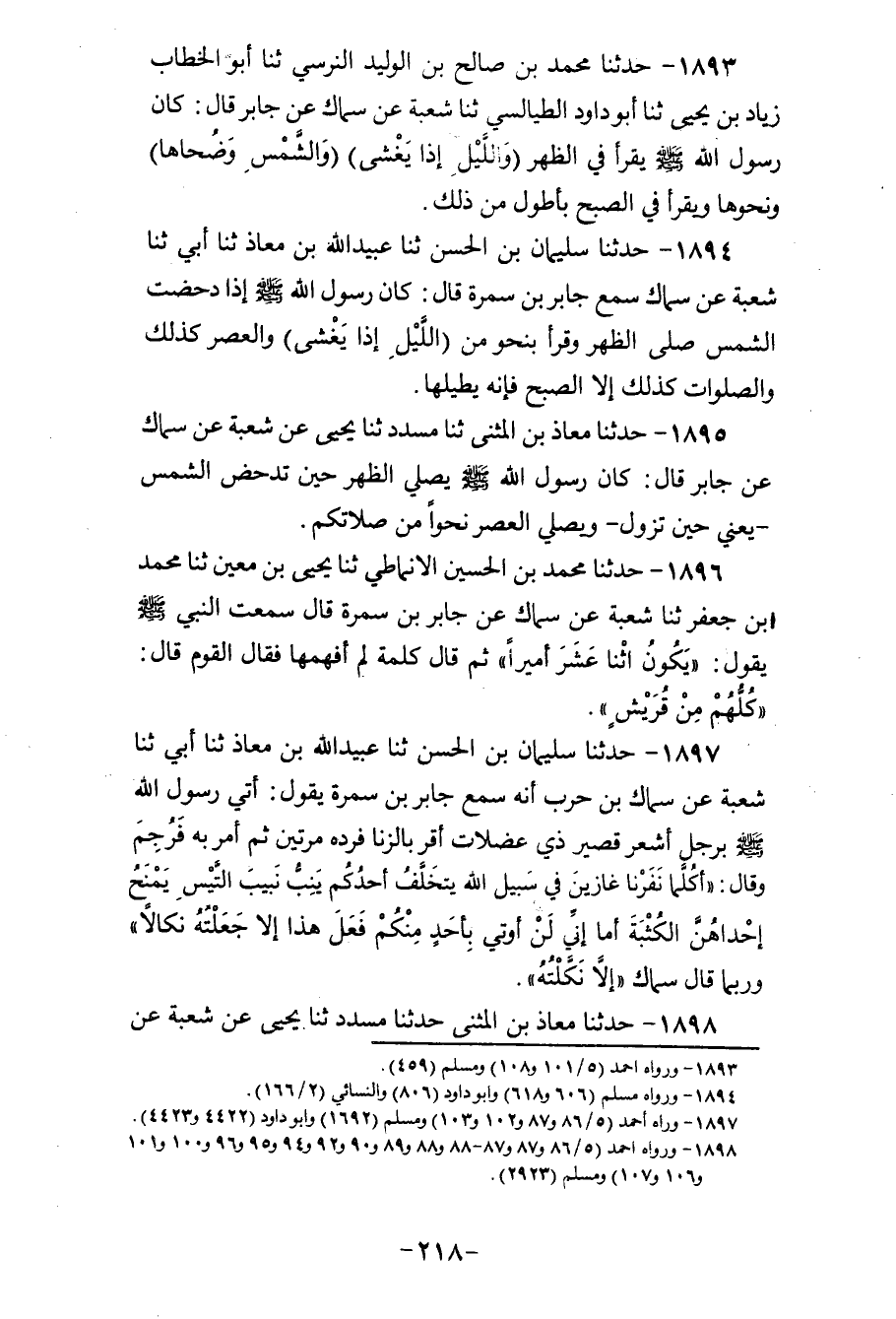 1896 - حَدَّثَنَا مُحَمَّدُ بْنُ الْحُسَيْنِ الْأَنْمَاطِيُّ، ثنا يَحْيَى بْنُ مَعِينٍ، ثنا مُحَمَّدُ بْنُ جَعْفَرٍ، ثنا شُعْبَةُ، عَنْ سِمَاكٍ، عَنْ جَابِرِ بْنِ سَمُرَةَ، قَالَ: سَمِعْتُ النَّبِيَّ صَلَّى اللهُ عَلَيْهِ وَسَلَّمَ يَقُولُ: «§يَكُونُ اثْنَا عَشَرَ أَمِيرًا» ، ثُمَّ قَالَ كَلِمَةً لَمْ أَفْهَمْهَا، فَقَالَ الْقَوْمُ: قَالَ: «كُلُّهُمْ مِنْ قُرَيْشٍ»