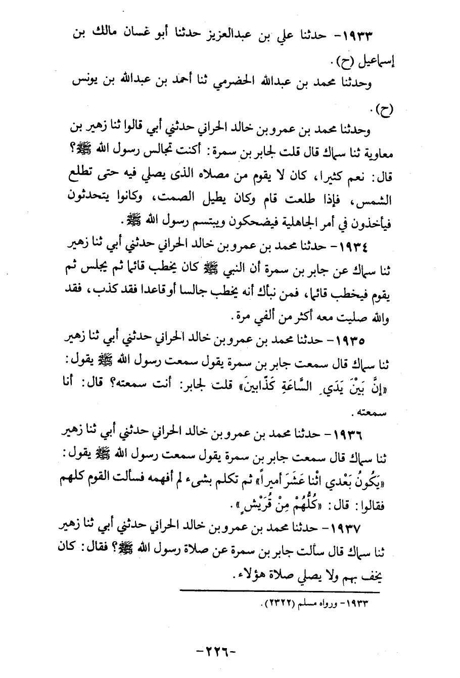 1936 - حَدَّثَنَا مُحَمَّدُ بْنُ عَمْرِو بْنِ خَالِدٍ الْحَرَّانِيُّ، حَدَّثَنِي أَبِي، ثنا زُهَيْرٌ، ثنا سِمَاكٌ، قَالَ: سَمِعْتُ جَابِرَ بْنَ سَمُرَةَ، يَقُولُ: سَمِعْتُ رَسُولَ اللهِ صَلَّى اللهُ عَلَيْهِ وَسَلَّمَ يَقُولُ: «§يَكُونُ بَعْدِي اثْنَا عَشَرَ أَمِيرًا» ثُمَّ تَكَلَّمَ بِشَيْءٍ لَمْ أَفْهَمْهُ، فَسَأَلْتُ الْقَوْمَ كُلَّهُمْ، فَقَالُوا: قَالَ: «كُلُّهُمْ مِنْ قُرَيْشٍ»