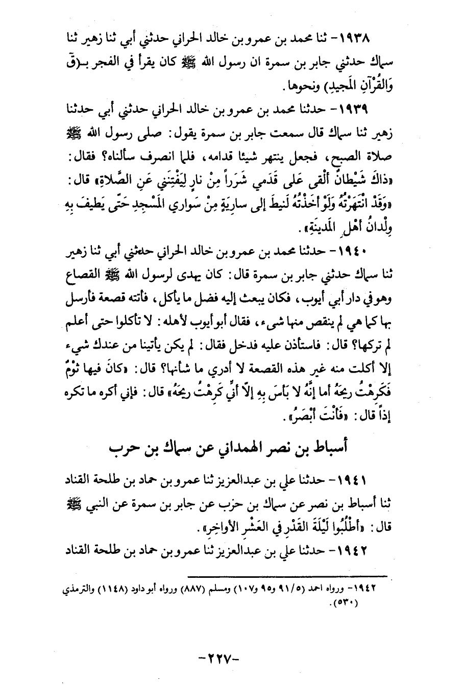 1939 - حَدَّثَنَا مُحَمَّدُ بْنُ عَمْرِو بْنِ خَالِدٍ الْحَرَّانِيُّ، حَدَّثَنِي أَبِي، حَدَّثَنَا زُهَيْرٌ، ثنا سِمَاكٌ، قَالَ: سَمِعْتُ جَابِرَ بْنَ سَمُرَةَ، يَقُولُ: صَلَّى رَسُولُ اللهِ صَلَّى اللهُ عَلَيْهِ وَسَلَّمَ صَلَاةَ الصُّبْحِ، فَجَعَلَ يَنْتَهِرُ شَيْئًا قُدَّامَهُ، فَلَمَّا انْصَرَفَ سَأَلْنَاهُ، فَقَالَ: «§ذَاكَ شَيْطَانٌ ألْقَى عَلَى قَدَمِي شَرَرًا مِنْ نَارٍ لِيَفْتِنَنِي عَنِ الصَّلَاةِ» قَالَ: «وَقَدِ انْتَهَرْتُهُ وَلَوْ أَخَذْتُهُ لَنِيطَ إِلَى سَارِيَةٍ مِنْ سَوَارِي الْمَسْجِدِ حَتَّى يَطِيفَ بِهِ وِلْدَانُ أَهْلِ الْمَدِينَةِ»