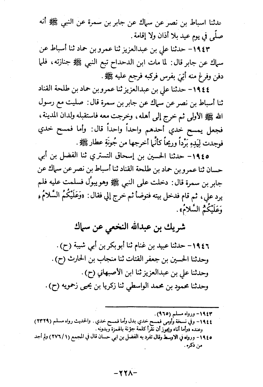 1945 - حَدَّثَنَا الْحُسَيْنُ بْنُ إِسْحَاقَ التُّسْتَرِيُّ، ثنا الْفَضْلُ بْنُ أَبِي حَسَّانَ، ثنا عَمْرُو بْنُ حَمَّادِ بْنِ طَلْحَةَ الْقَنَّادُ، ثنا أَسْبَاطُ بْنُ نَصْرٍ، عَنْ سِمَاكٍ، عَنْ جَابِرِ بْنِ سَمُرَةَ، قَالَ: §دَخَلْتُ عَلَى النَّبِيِّ صَلَّى اللهُ عَلَيْهِ وَسَلَّمَ وَهُوَ يَبُولُ فَسَلَّمْتُ عَلَيْهِ فَلَمْ يَرُدَّ عَلَيَّ، ثُمَّ قَامَ فَدَخَلَ بَيْتَهُ فَتَوَضَّأَ ثُمَّ خَرَجَ إِلَيَّ، فَقَالَ: «وَعَلَيْكُمِ السَّلَامُ وَعَلَيْكُمِ السَّلَامُ»