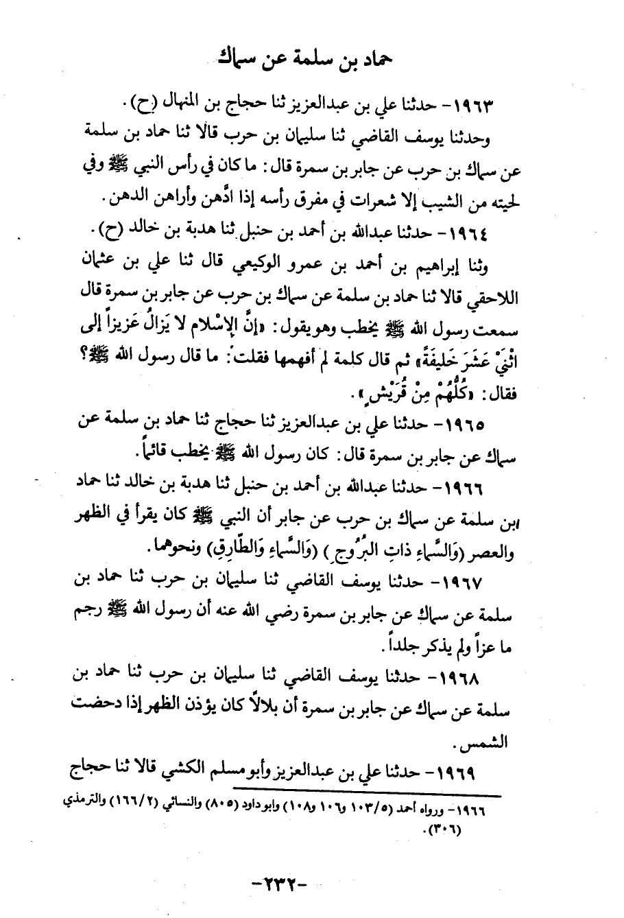 1964 - حَدَّثَنَا عَبْدُ اللهِ بْنُ أَحْمَدَ بْنِ حَنْبَلٍ، ثنا هُدْبَةُ بْنُ خَالِدٍ، ح وَثَنَا إِبْرَاهِيمُ بْنُ أَحْمَدَ بْنِ عَمْرٍو الْوَكِيعِيُّ، قَالَ: ثنا عَلِيُّ بْنُ عُثْمَانَ اللَّاحِقِيُّ، قَالَا: ثنا حَمَّادُ بْنُ سَلَمَةَ، عَنْ سِمَاكِ بْنِ حَرْبٍ، عَنْ جَابِرِ بْنِ سَمُرَةَ، قَالَ: سَمِعْتُ رَسُولَ اللهِ صَلَّى اللهُ عَلَيْهِ وَسَلَّمَ يَخْطُبُ وَهُوَ يَقُولُ: «إِنَّ §الْإِسْلَامَ لَا يَزَالُ عَزِيزًا إِلَى اثْنَيْ عَشَرَ خَلِيفَةً» ثُمَّ قَالَ كَلِمَةً لَمْ أَفْهَمْهَا، فَقُلْتُ: مَا قَالَ رَسُولُ اللهِ صَلَّى اللهُ عَلَيْهِ وَسَلَّمَ؟ فَقَالَ: «كُلُّهُمْ مِنْ قُرَيْشٍ»