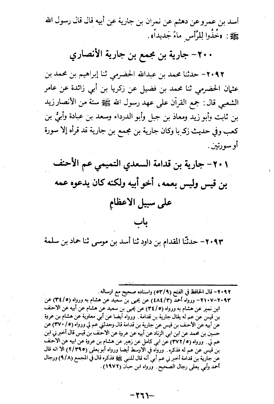 2092 - حَدَّثَنَا مُحَمَّدُ بْنُ عَبْدِ اللهِ الْحَضْرَمِيُّ، ثنا إِبْرَاهِيمُ بْنُ مُحَمَّدِ بْنِ عُثْمَانَ الْحَضْرَمِيُّ، ثنا مُحَمَّدُ بْنُ فُضَيْلٍ، عَنْ زَكَرِيَّا بْنِ أَبِي زَائِدَةَ، عَنْ عَامِرٍ الشَّعْبِيِّ، قَالَ: «§جَمَعَ الْقُرْآنَ عَلَى عَهْدِ رَسُولِ اللهِ صَلَّى اللهُ عَلَيْهِ وَسَلَّمَ سِتَّةٌ مِنَ الْأَنْصَارِ زَيْدُ بْنُ ثَابِتٍ، وَأَبُو زَيْدٍ، وَمُعَاذُ بْنُ جَبَلٍ، وَأَبُو الدَّرْدَاءِ، وَسَعْدُ بْنُ عُبَادَةَ، وَأُبَيُّ بْنُ كَعْبٍ، وَفِي حَدِيثِ زَكَرِيَّا وَكَانَ جَارِيَةُ بْنُ مُجَمِّعِ بْنِ جَارِيَةَ قَدْ قَرَأَهُ إِلَّا سُورَةً أَوْ سُورَتَيْنِ»